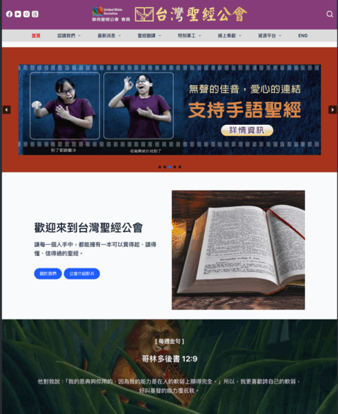 台灣聖經公會-網站上線 台灣聖經公會 – 新網站正式上線2025 年 11 月 18 日公告事項 感謝主,讓我們新版的網站正式上線。 目前仍有些小部分需要優化,在本週仍會進行除錯與調整,以提供最佳的使用感受給所有的弟兄姊妹。新版本的網站,將可以適用於各種瀏覽裝置,尤其是手機的瀏覽;並重新規劃使用動線以及功能分配。 感謝您支持台灣聖經公會的事工 標籤# 台灣聖經公會# 新網站 在 Facebook 分享 在 X (Twitter) 分享 在 Pinterest 分享 在 LinkedIn 分享 在 Line 分享 複製至剪貼簿 上一 文章 徵才啟事(2025/11)