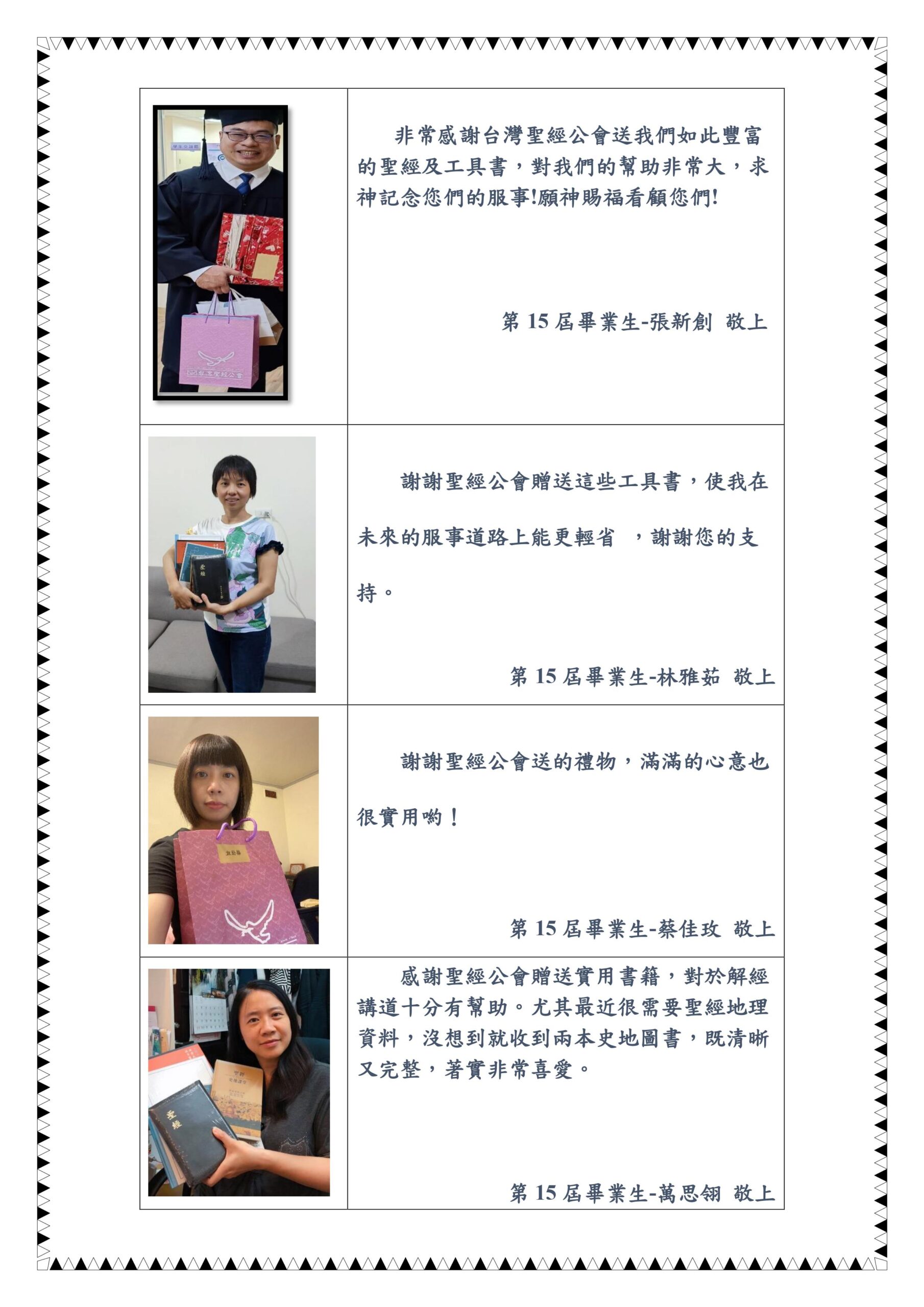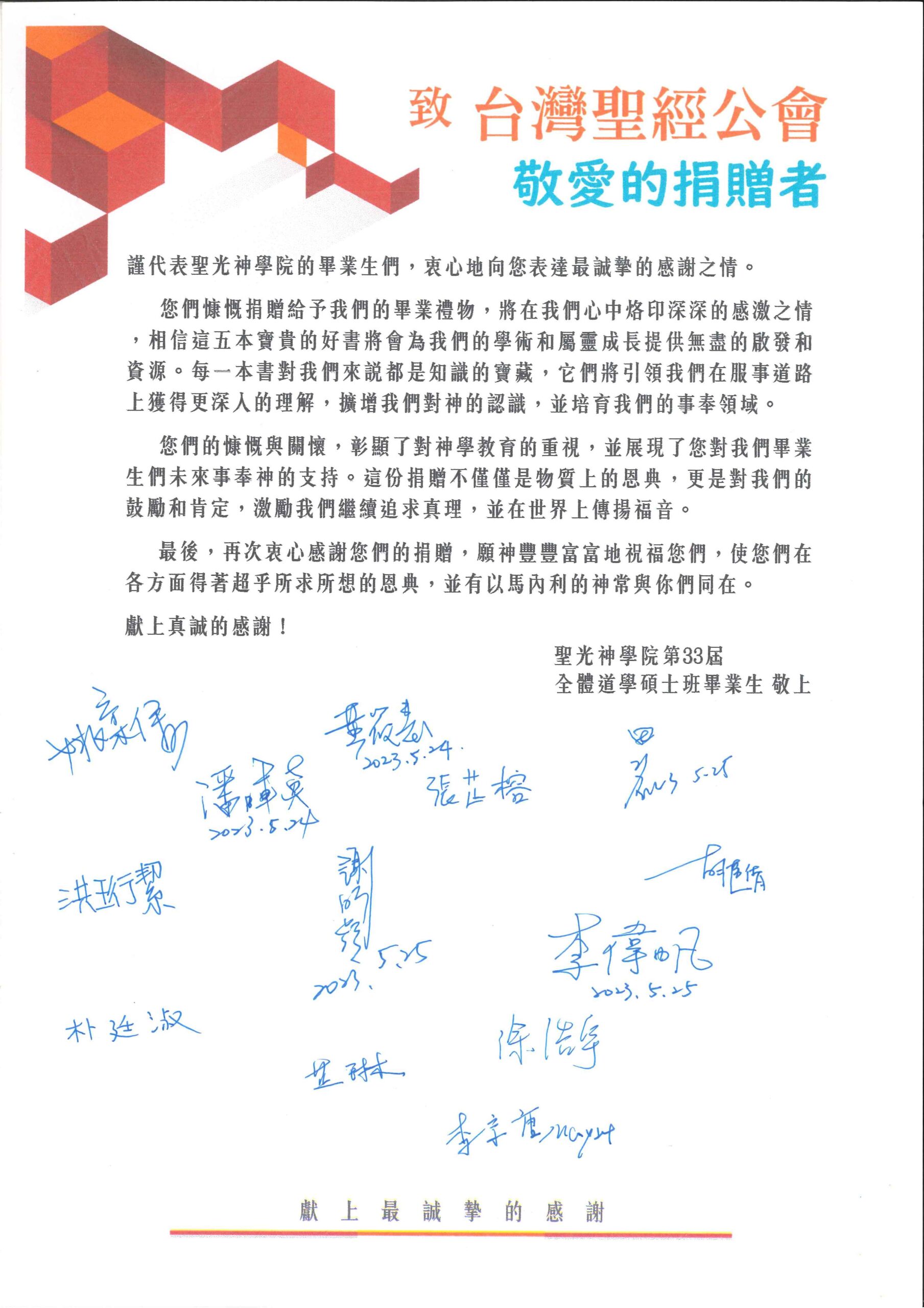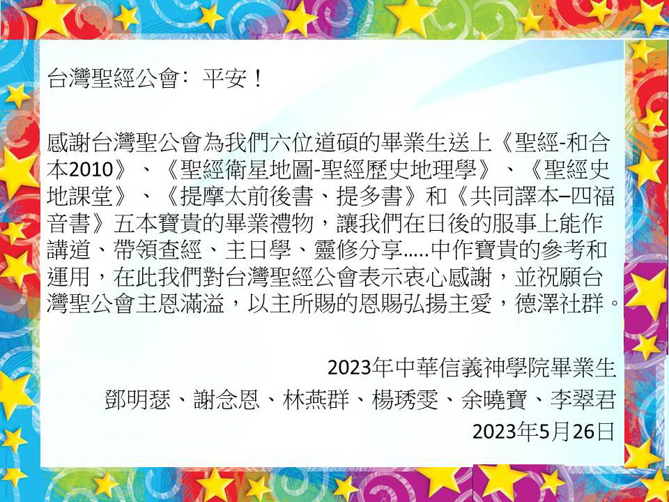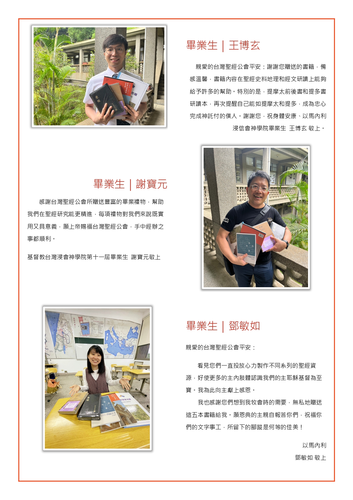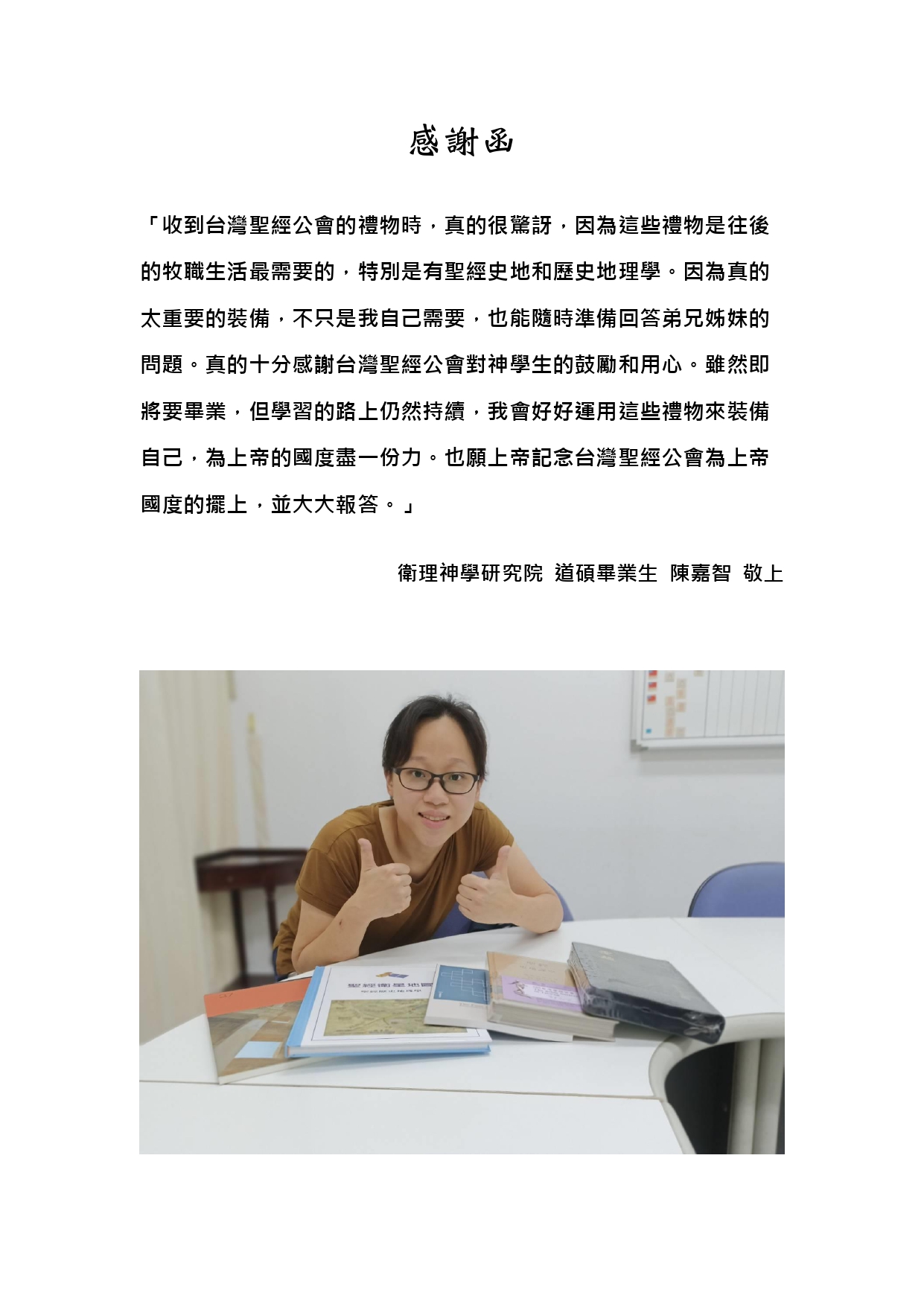 特感謝臺灣聖經公會對應屆畢業生的鼓勵,贈送精美的聖經、聖經衛星地圖、及其他研經書籍等,此特別禮物將是我們服事主當中極佳的參考用書,以及服事過程中之動力來源之一。再次感恩聖經公會的支持,祈願主賜福聖經公會所有事工盡都順遂與平安!