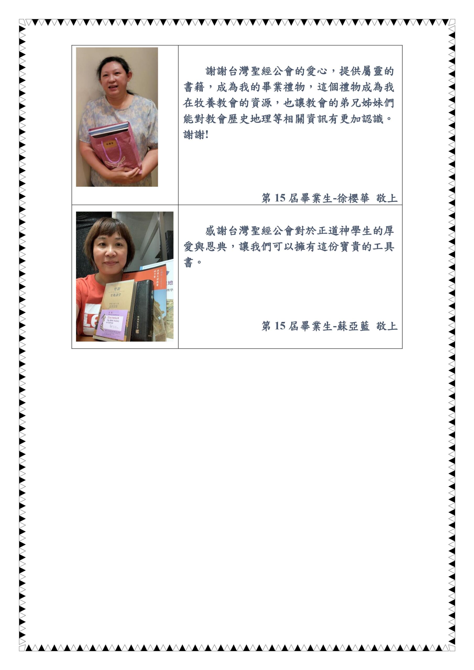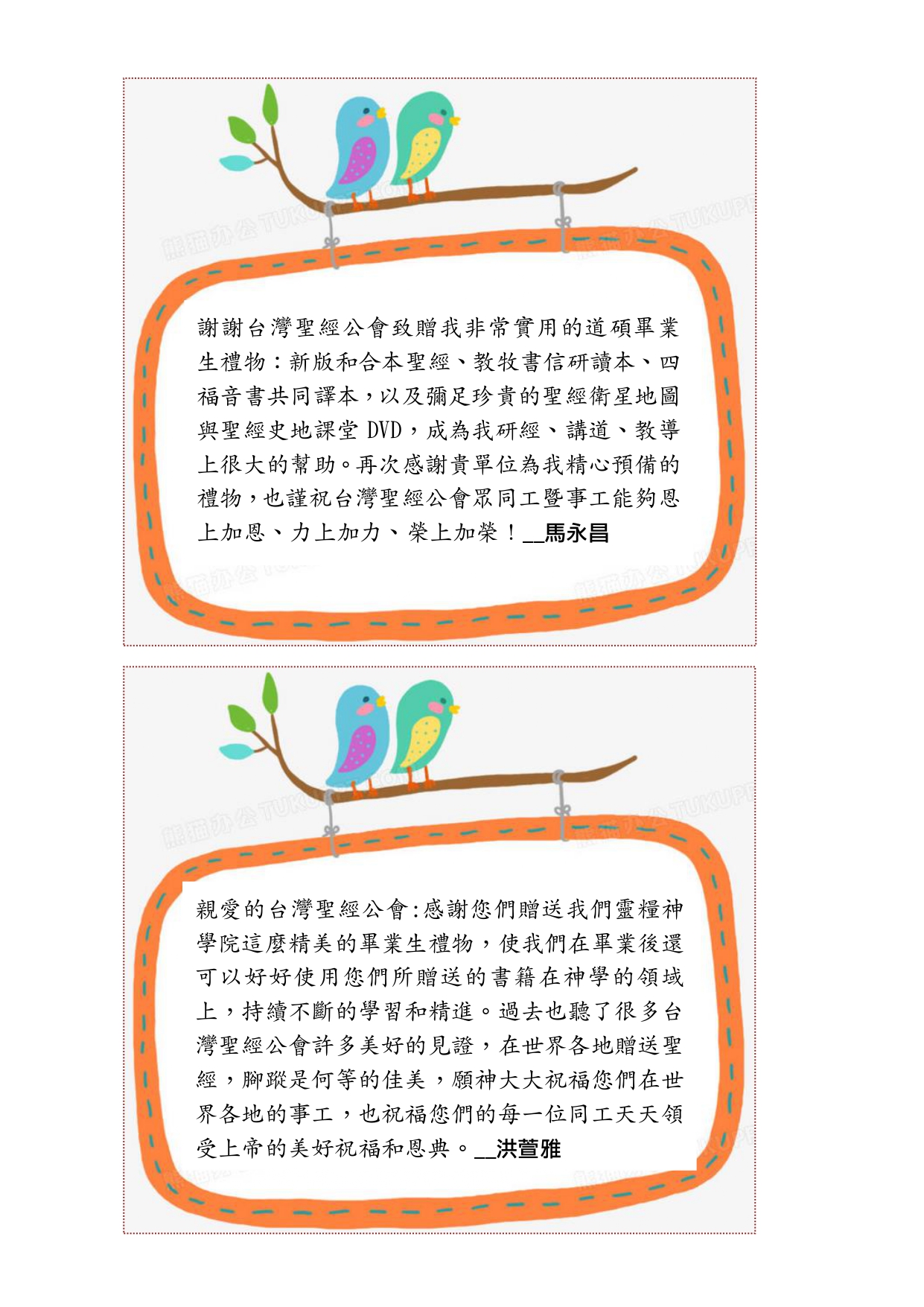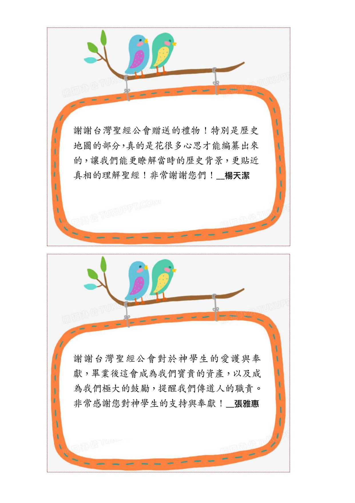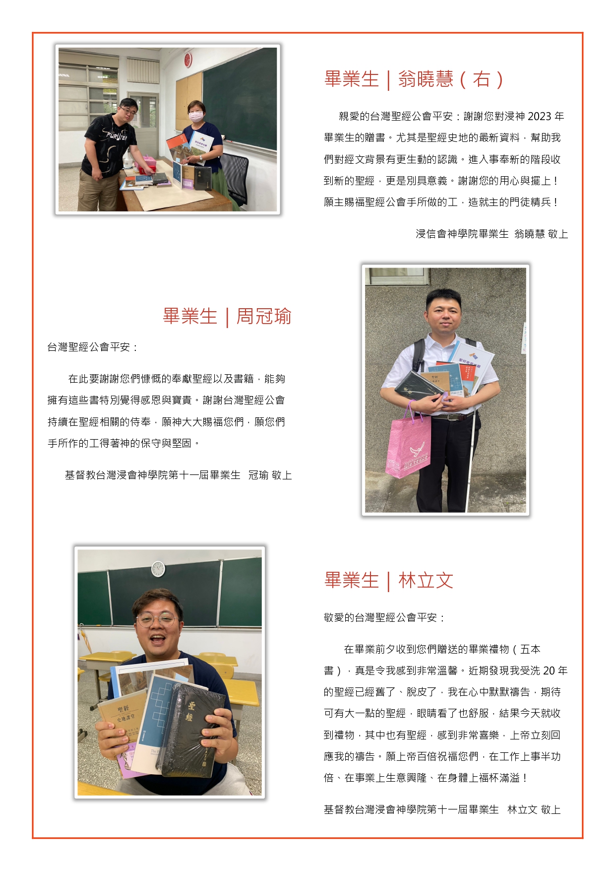 特感謝臺灣聖經公會對應屆畢業生的鼓勵,贈送精美的聖經、聖經衛星地圖、及其他研經書籍等,此特別禮物將是我們服事主當中極佳的參考用書,以及服事過程中之動力來源之一。再次感恩聖經公會的支持,祈願主賜福聖經公會所有事工盡都順遂與平安!
