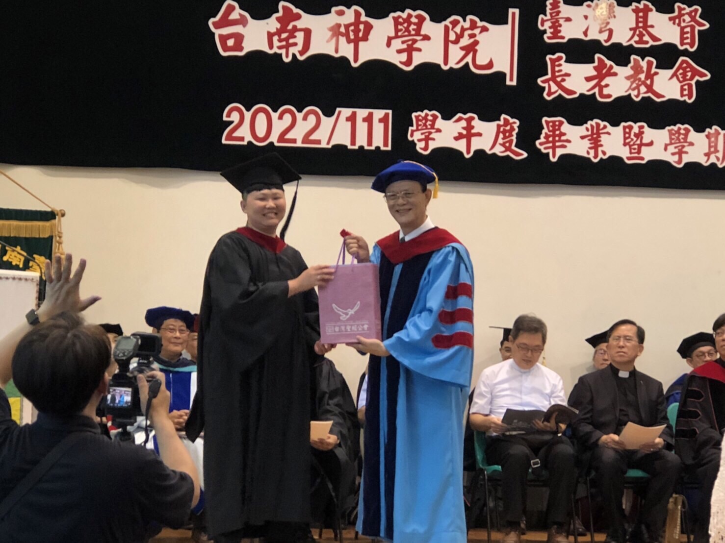 我是玉山神學院畢業生林思恩,在這畢業的節期,祝福您們一切順利!誠摯感謝貴單位贈送我們玉山神學院2022學年度畢業班級的珍貴禮物:使徒行傳、山上寶訓、加拉太書、四福音書共同譯本、聖經史地課堂DVD、翁修恭牧師講道集。這些珍貴的工具書,是我們未來在牧會的好夥伴。