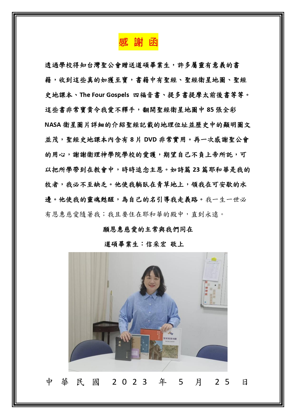 感謝貴單位眷顧神工人,各種工具書的需要,並且能夠以實際贈書來支持未來的傳道人,這是很大的鼓勵盼持續支持神工人各樣的書目需要。也願上帝的恩惠和祝福在貴單位各樣的事工、每一家庭裡面。劉毓姿