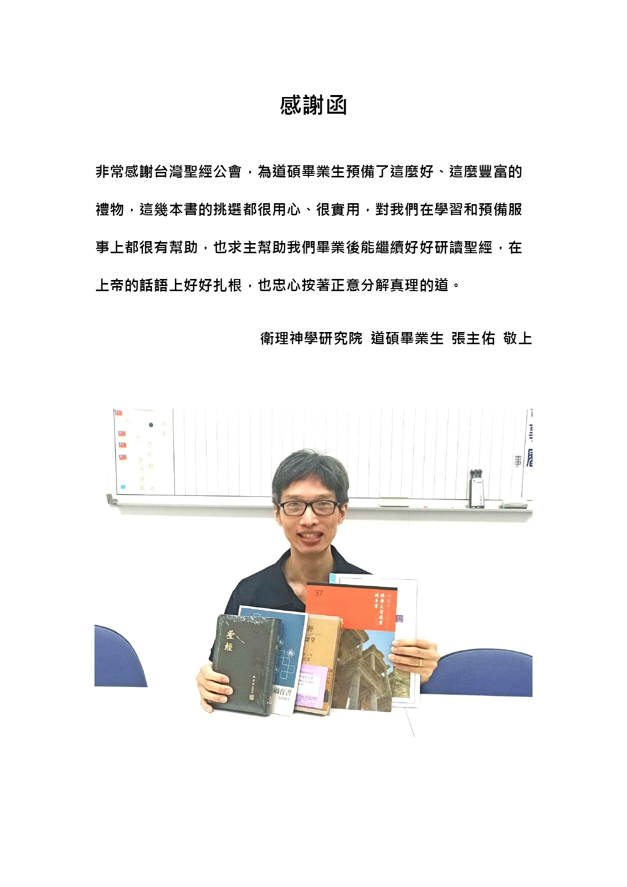 感謝台灣聖經公會每年給予我們這些即將步入禾場的神學生們的支持與鼓勵,且透過贈與我們這些書籍讓我們在未來牧會的過程中,能夠有更多的幫助與祝福。衛怡廷