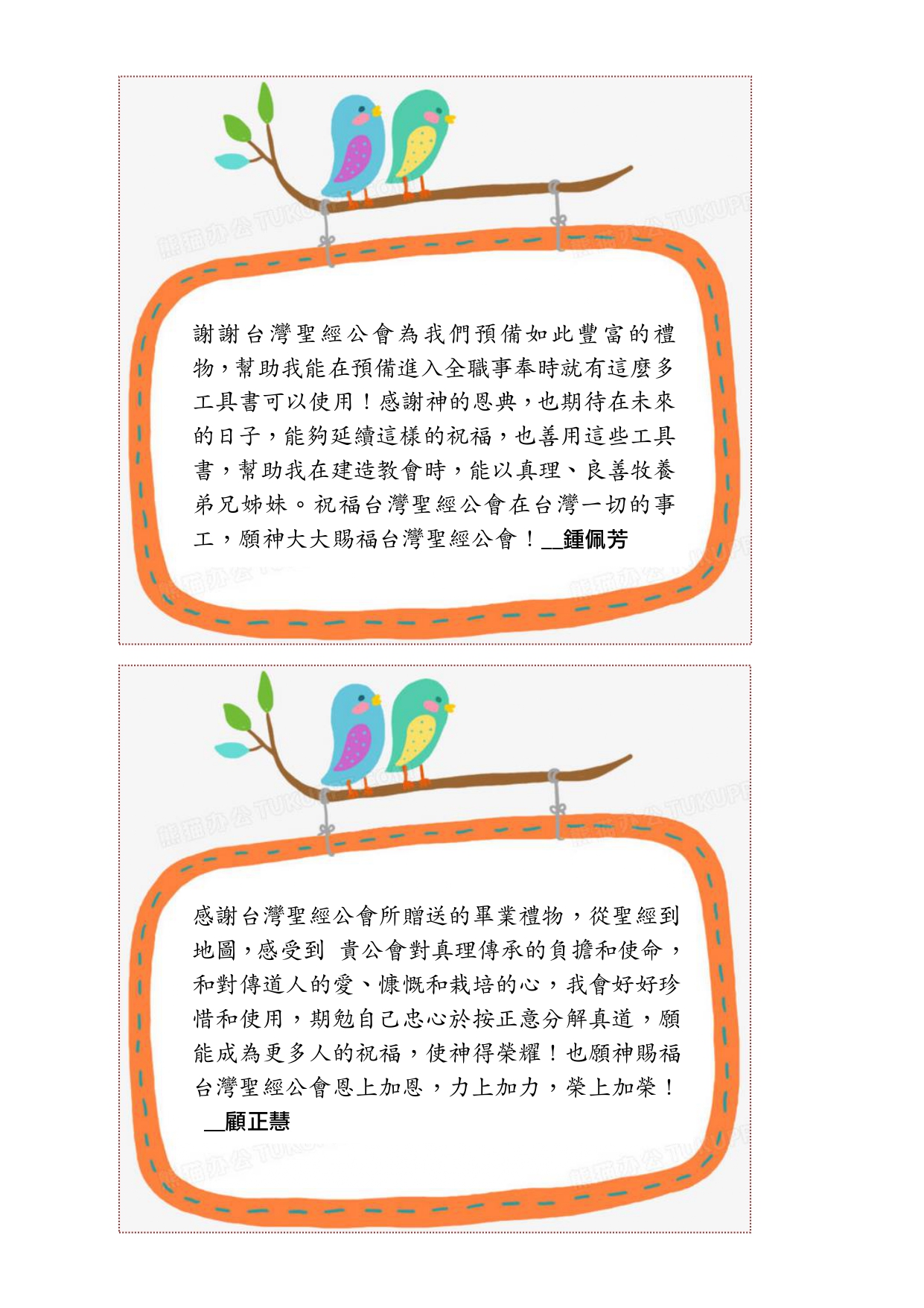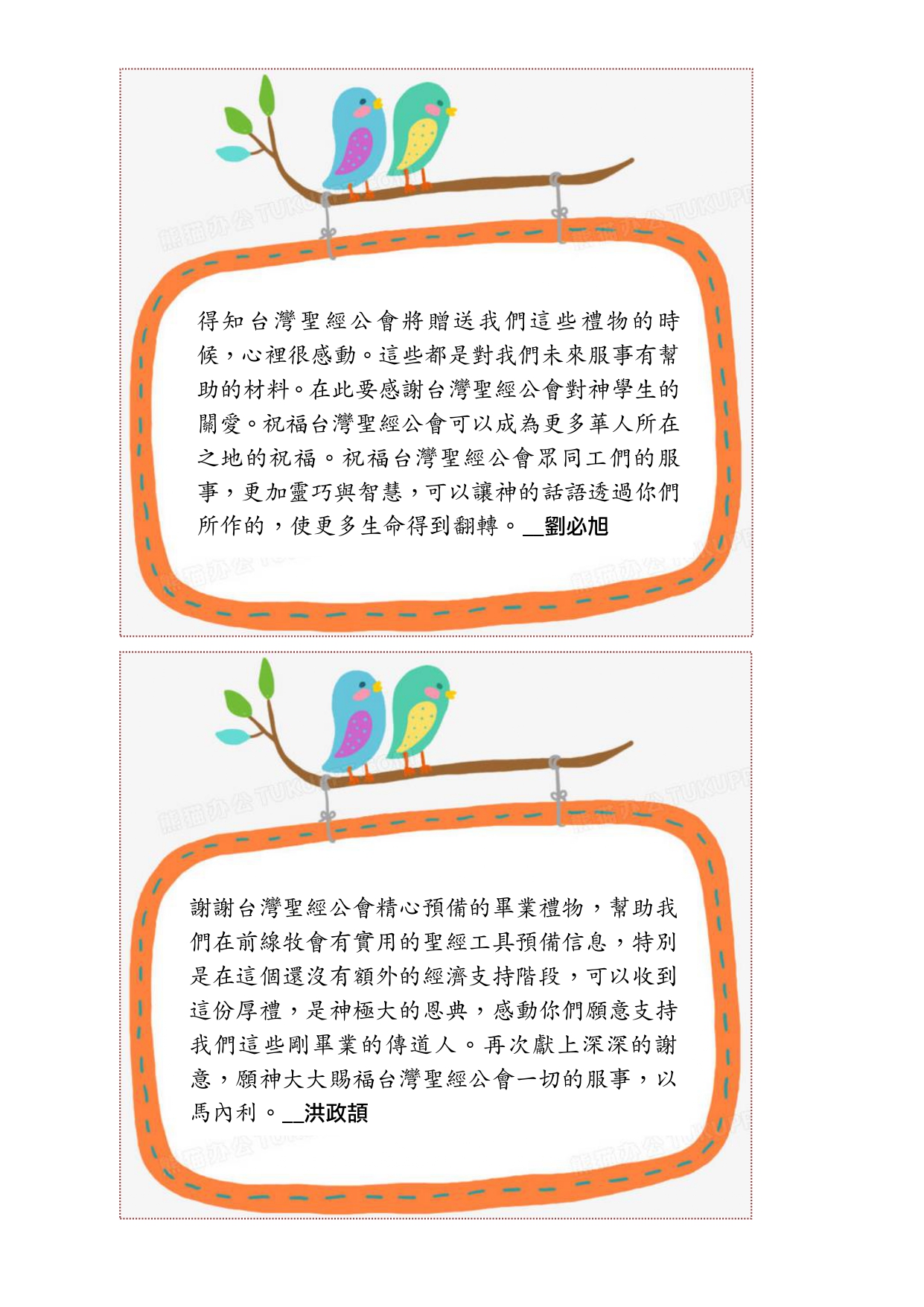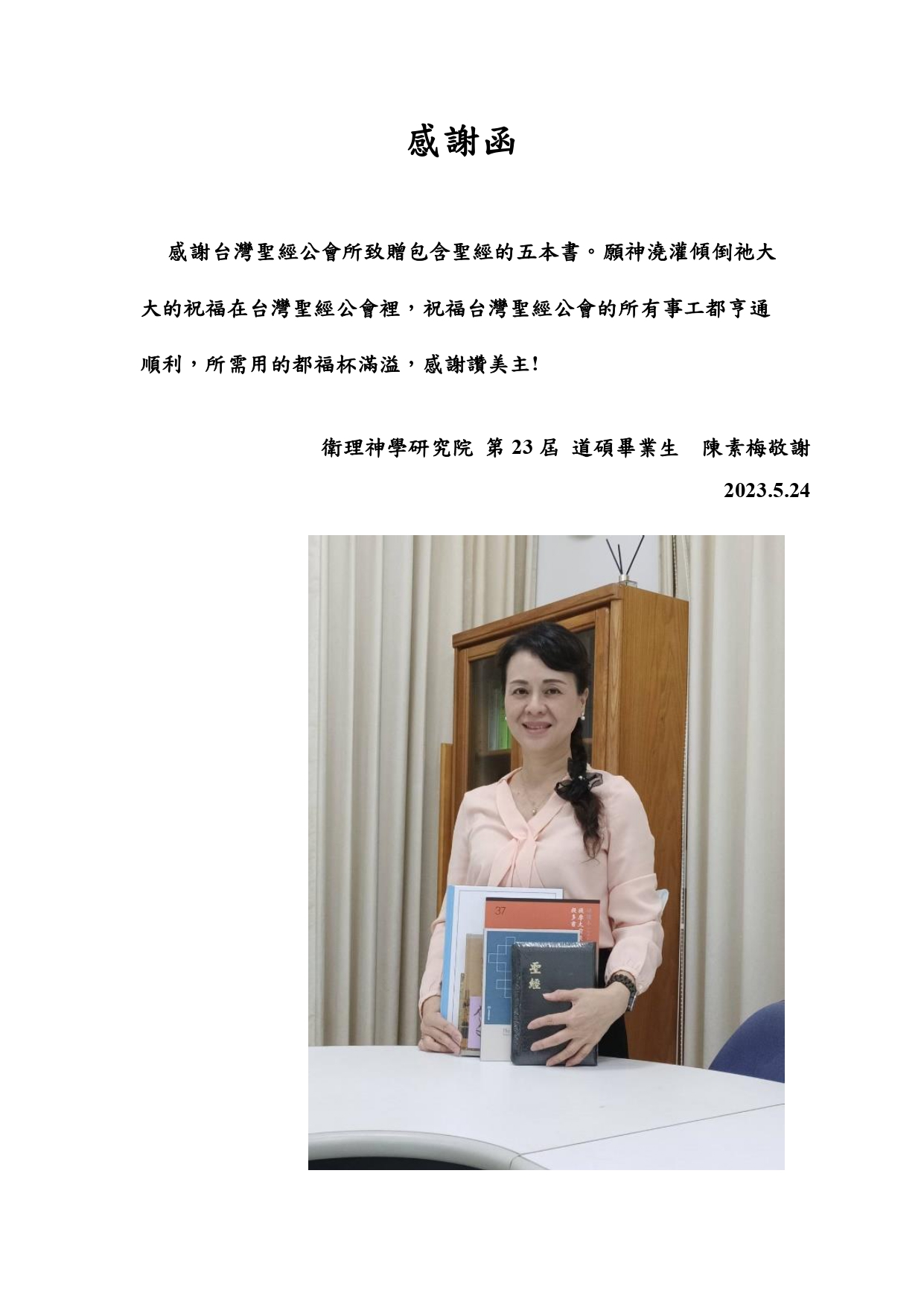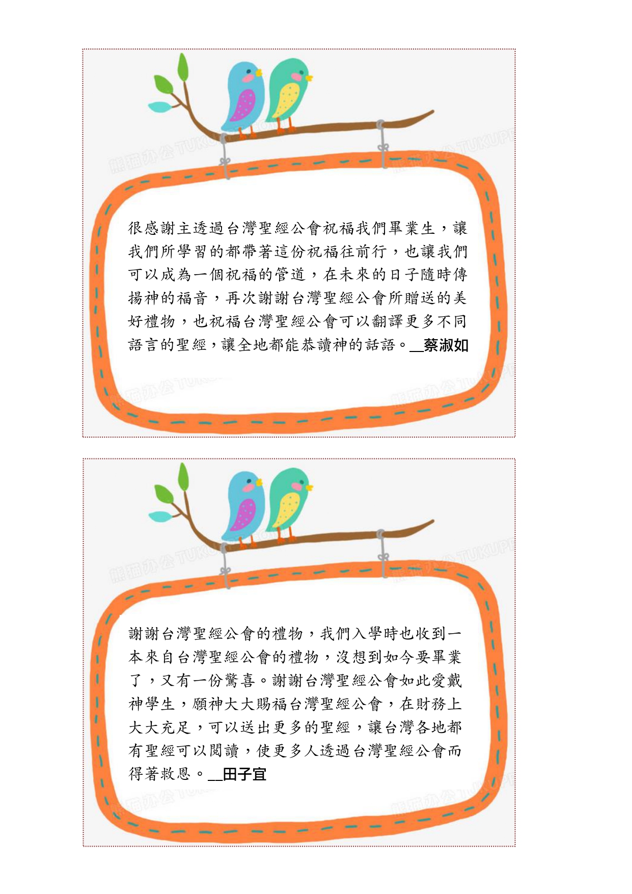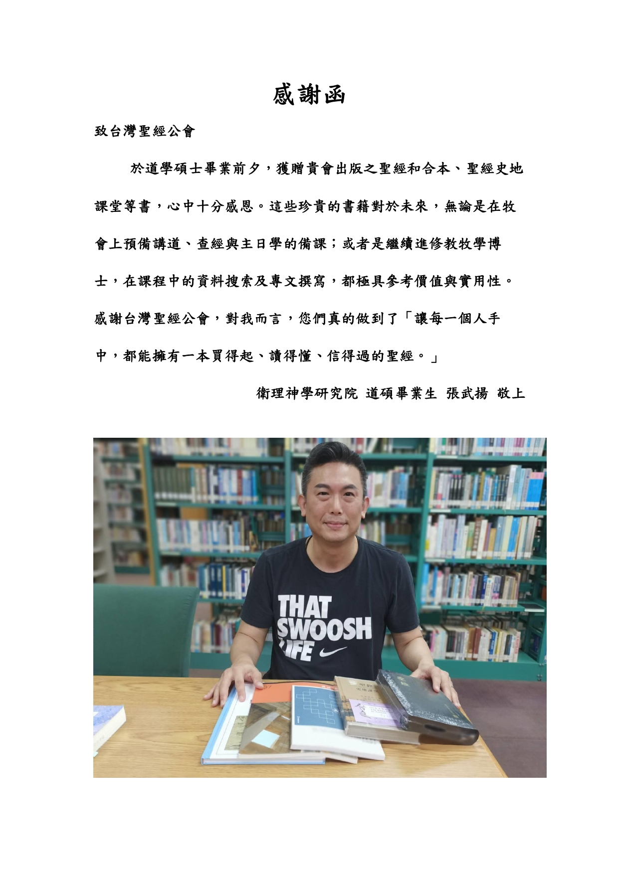 感謝台灣聖經公會對於我們的疼愛,我們會珍惜台灣聖經公會所贈與的書籍,在未來的禾場中善用,願上帝祝福您們手所做的工,賜福您們一切蒙恩平安楊文馨
