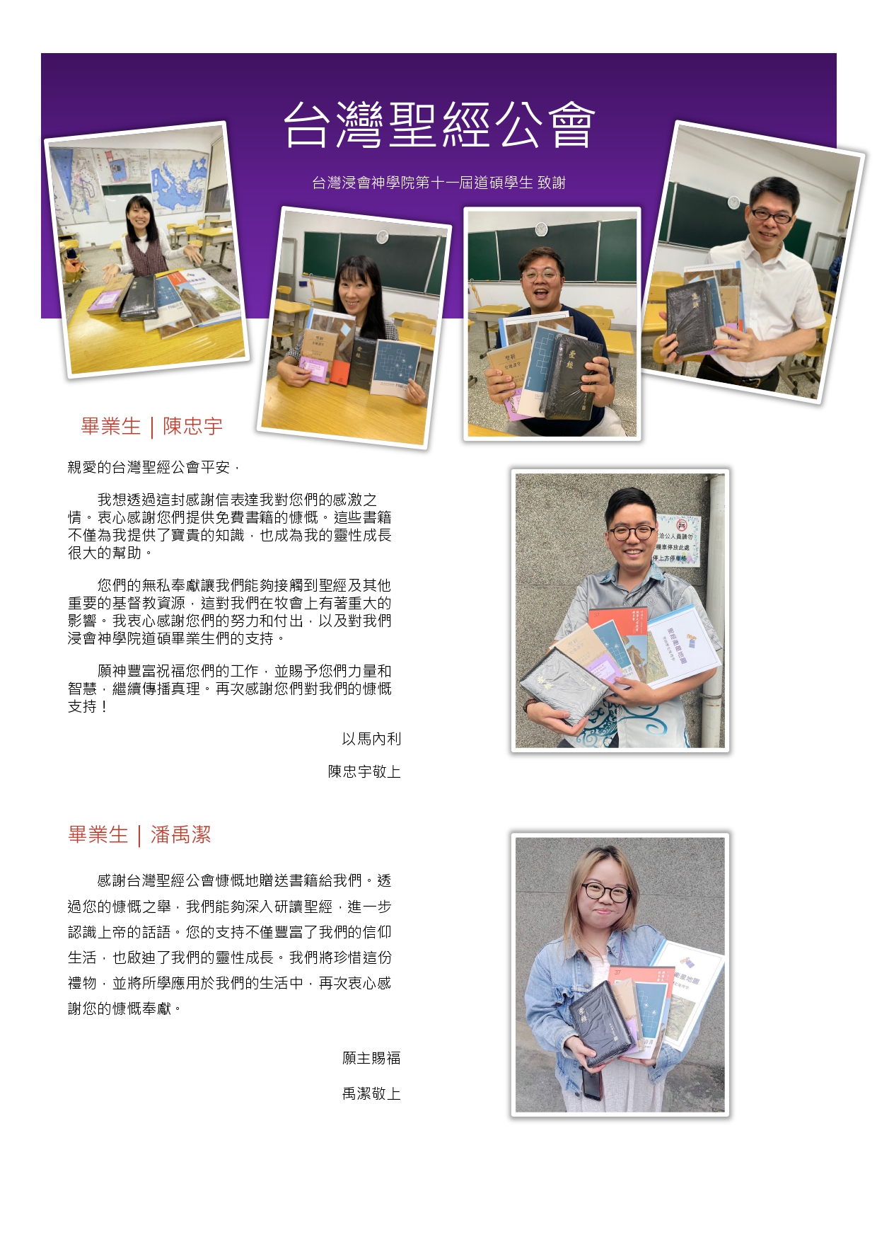 謝謝台灣聖經公會一直以來對神學生的悉心栽培,讓神學生能得到聖言的餵養,進一步分享給會友及慕道朋友們。願上帝按您們所行的報答您們!