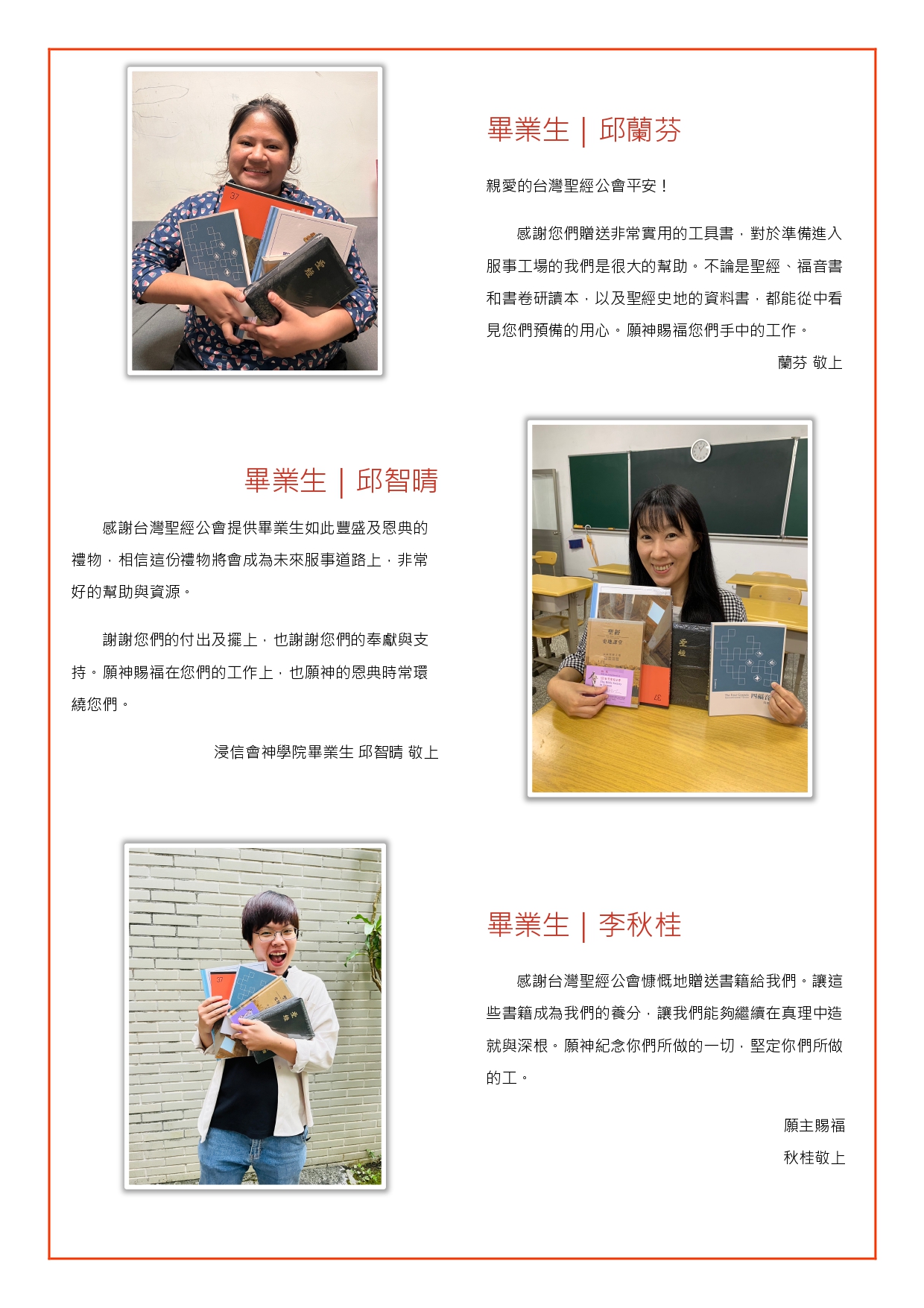 感謝台灣聖經公會贈送的畢業禮物:《聖經和合本 2010 》、《聖經衛星地圖 聖經歷史地理學》、《聖經史地課堂》、《提摩太前後書、提多書》聖經研讀本系列、《共同譯本 四福音書》。這份禮物帶來驚喜與使命的堅定, 在未來神話語的傳講上,多了工具成為輔助的力量。謝謝您們的祝福,也謝謝所有以金錢支持的兄姊們。陳美治