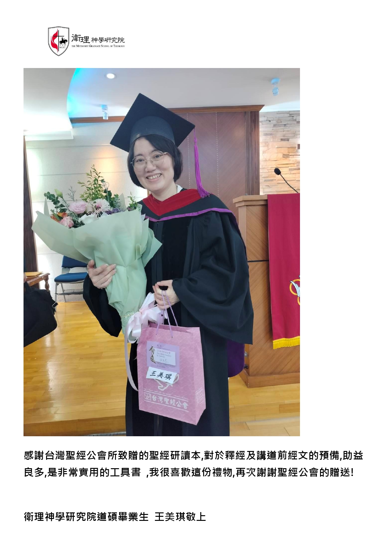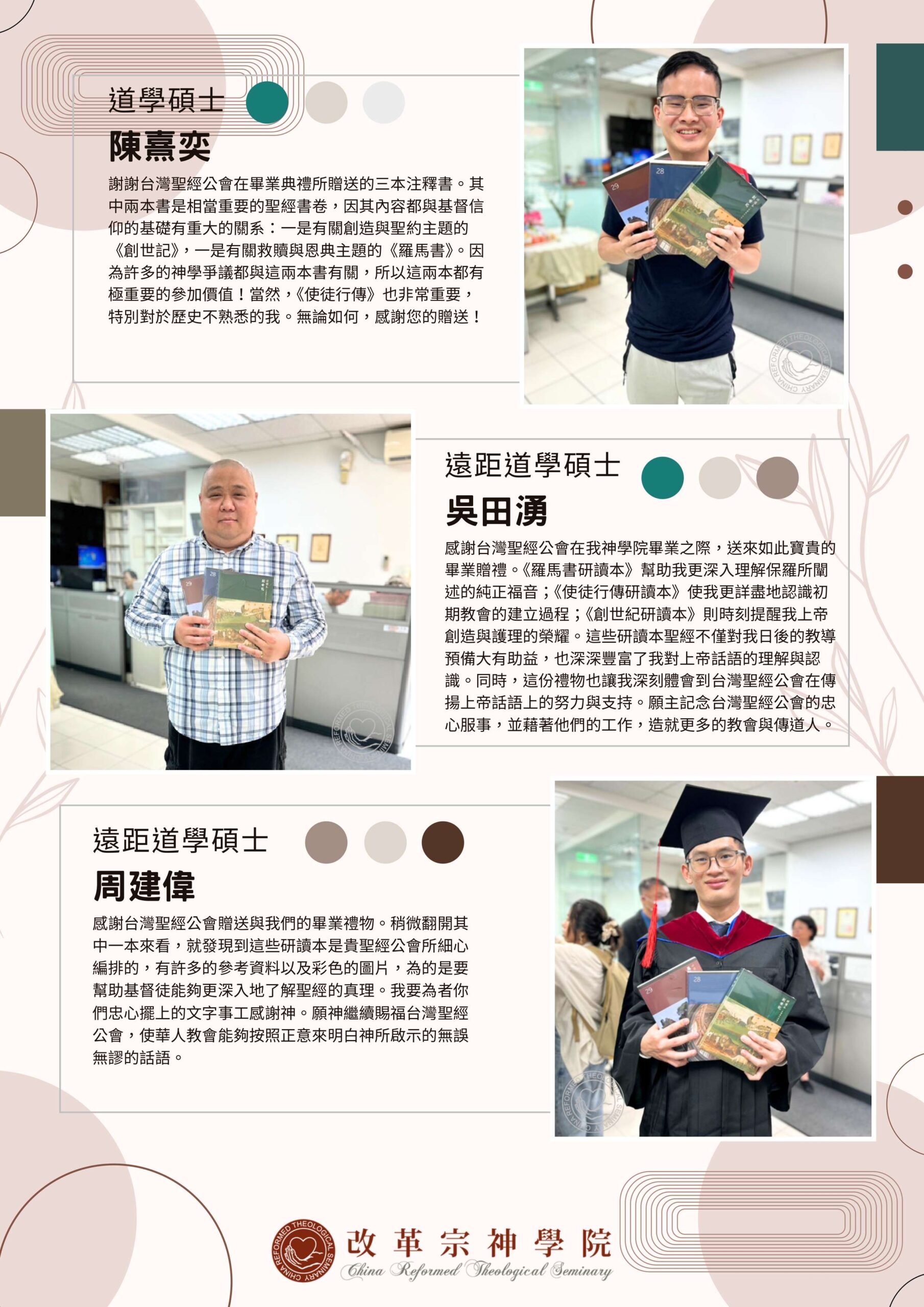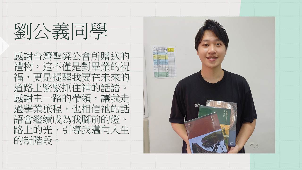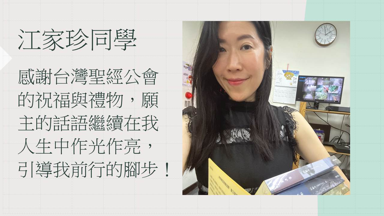 在這充滿恩典的畢業季節,我們懷著深深的感恩,感謝台灣聖經公會慷慨贈送的書籍。感謝台灣聖經公會於我們一年級剛入學時,就以實用禮物來祝福我們在校的學習。三年後,又能在即將畢業之際,收到這三本書籍作為畢業祝福,真的是莫大的恩典!
