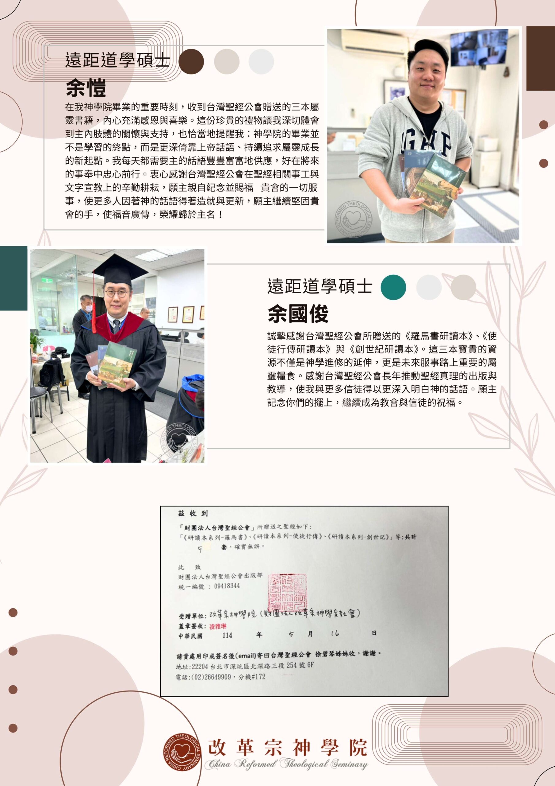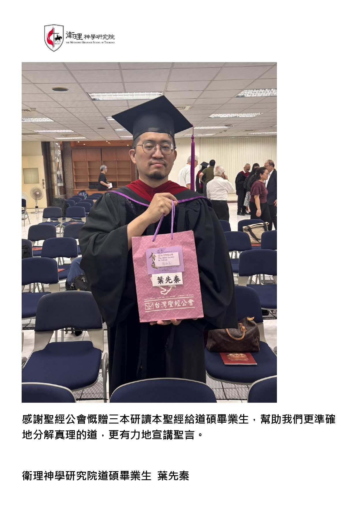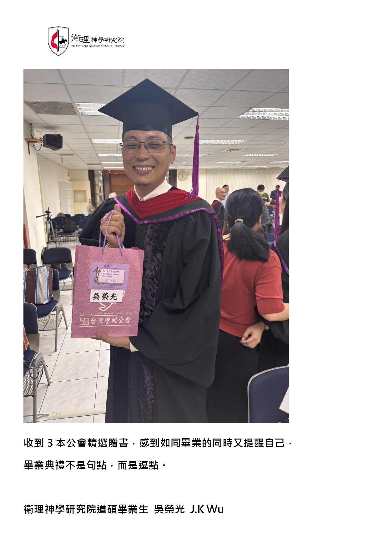 在這充滿恩典的畢業季節,我們懷著深深的感恩,感謝台灣聖經公會慷慨贈送的書籍。感謝台灣聖經公會於我們一年級剛入學時,就以實用禮物來祝福我們在校的學習。三年後,又能在即將畢業之際,收到這三本書籍作為畢業祝福,真的是莫大的恩典!