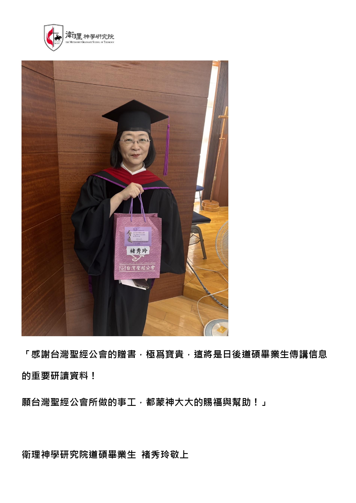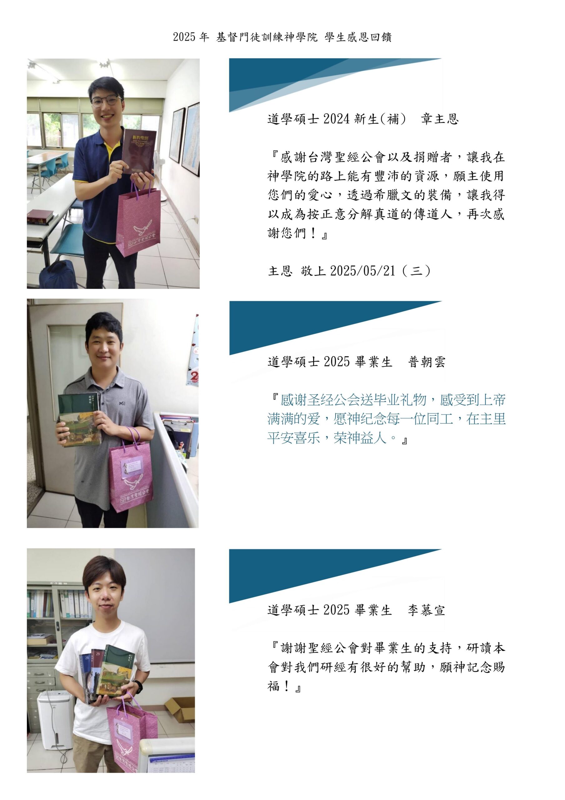 蒙受上帝厚恩,逢畢業之時,藉由台灣聖經公會贈送三本研讀聖經書籍(創世紀、使徒行傳、羅馬書),使現已投身在教會服事的夫/婦傳道人,在傳講上帝話語以先,首先能沐浴在上帝的愛中,並在靜默中領受從祂而來的話語,再藉祂僕人的口,成為會眾生命的幫助,建造與更新信徒的靈命。