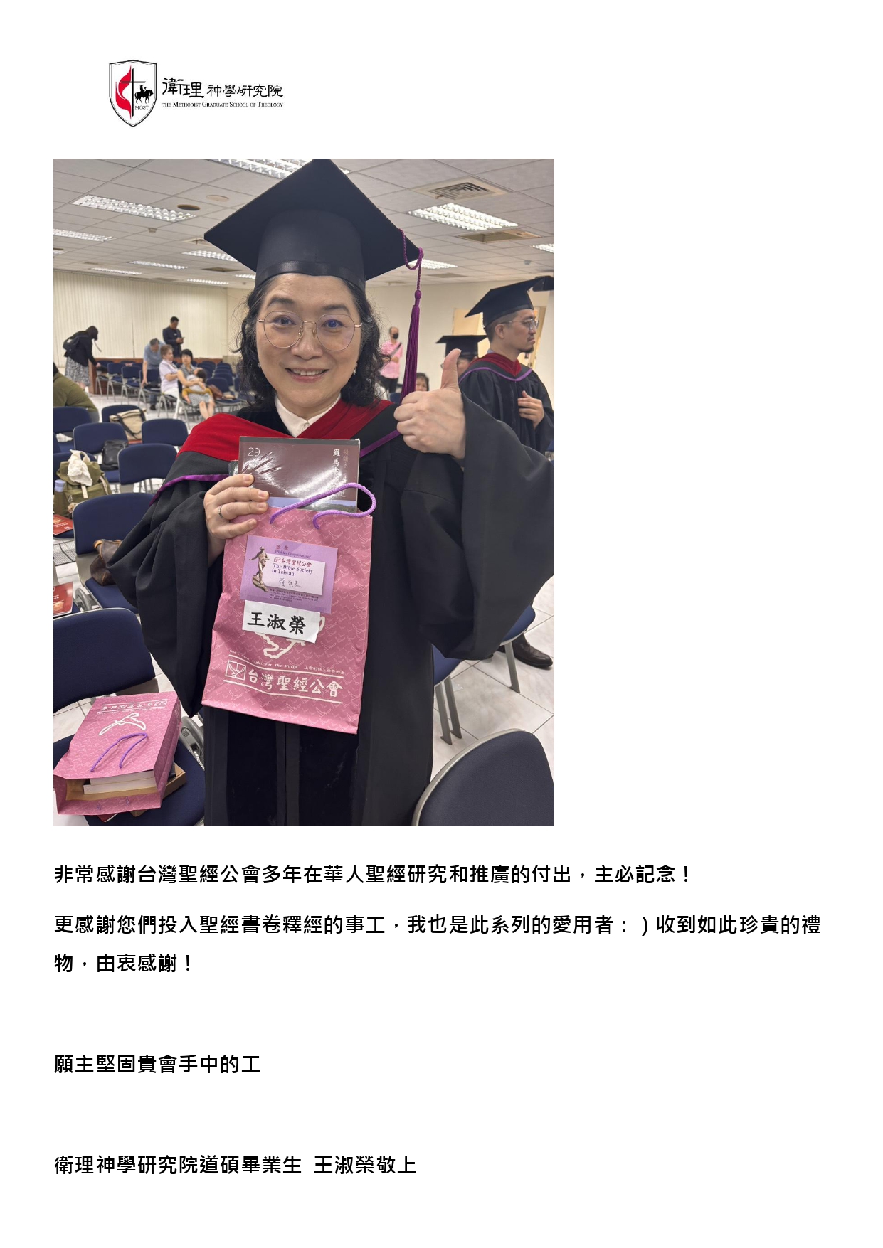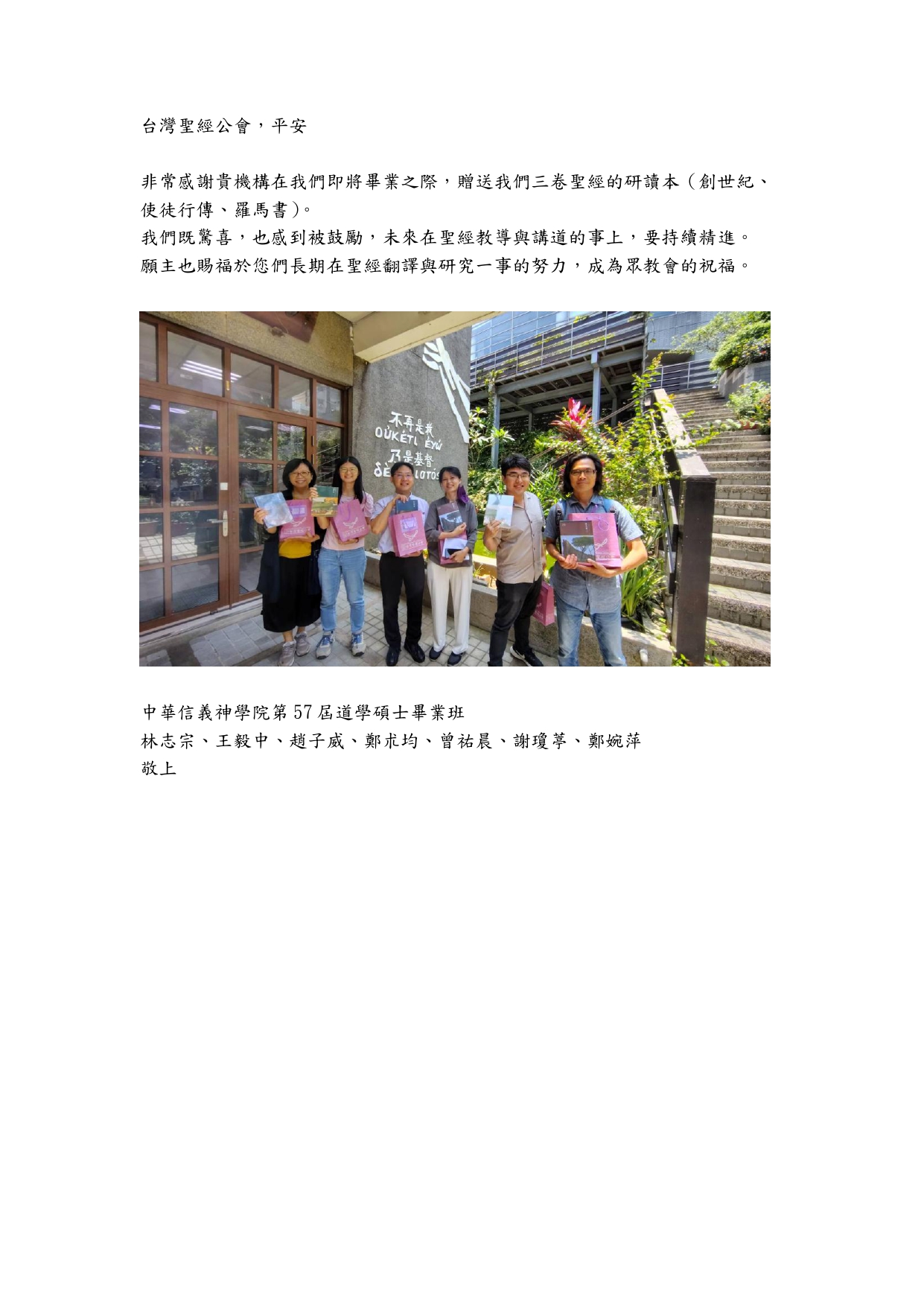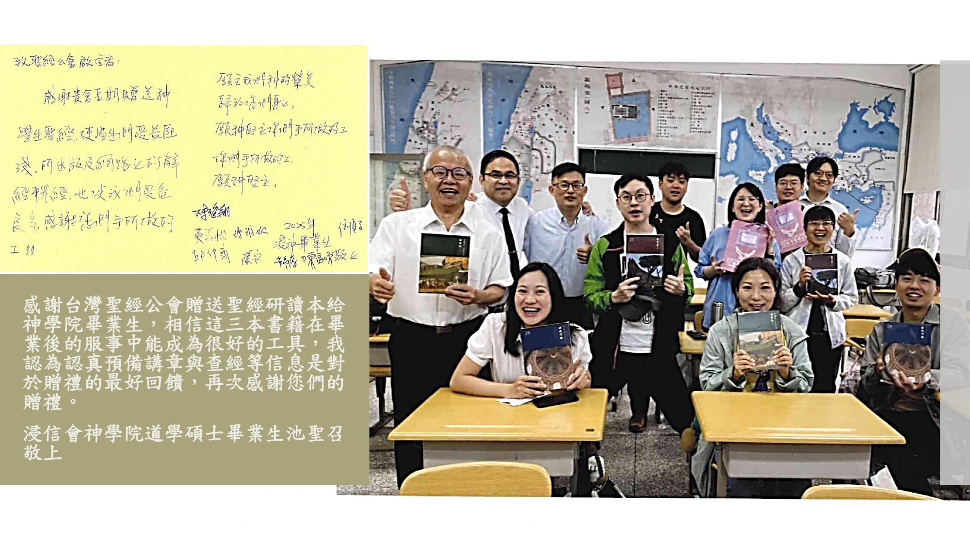 感謝台灣聖經公會的贈書,這份禮物是我們神學裝備旅程中一份同行的記號。畢業後我們會帶著這祝福,忠心前行,服事所託付的群體。再次感謝您們充滿溫暖的禮物!