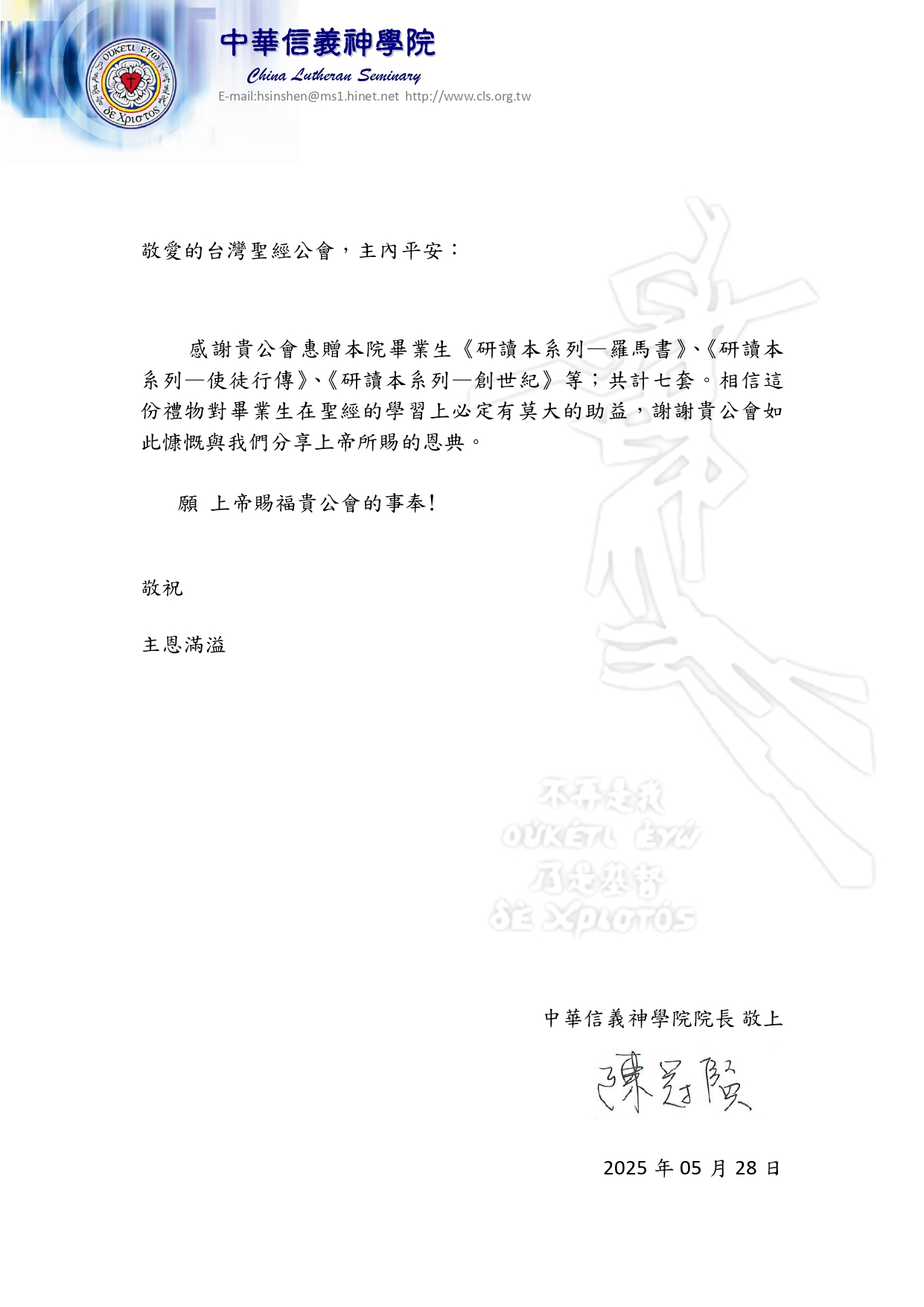 這次收到您們所贈的三本研讀書籍——《創世紀》、《使徒行傳》和《羅馬書》,對我來說真的是牧會旅程中的一大祝福。我相信,這些資源不只幫助我們更深入認識神的話,也會成為我們傳講真理、牧養群體的堅強後盾,並且在未來的服事中結出豐盛的果子。