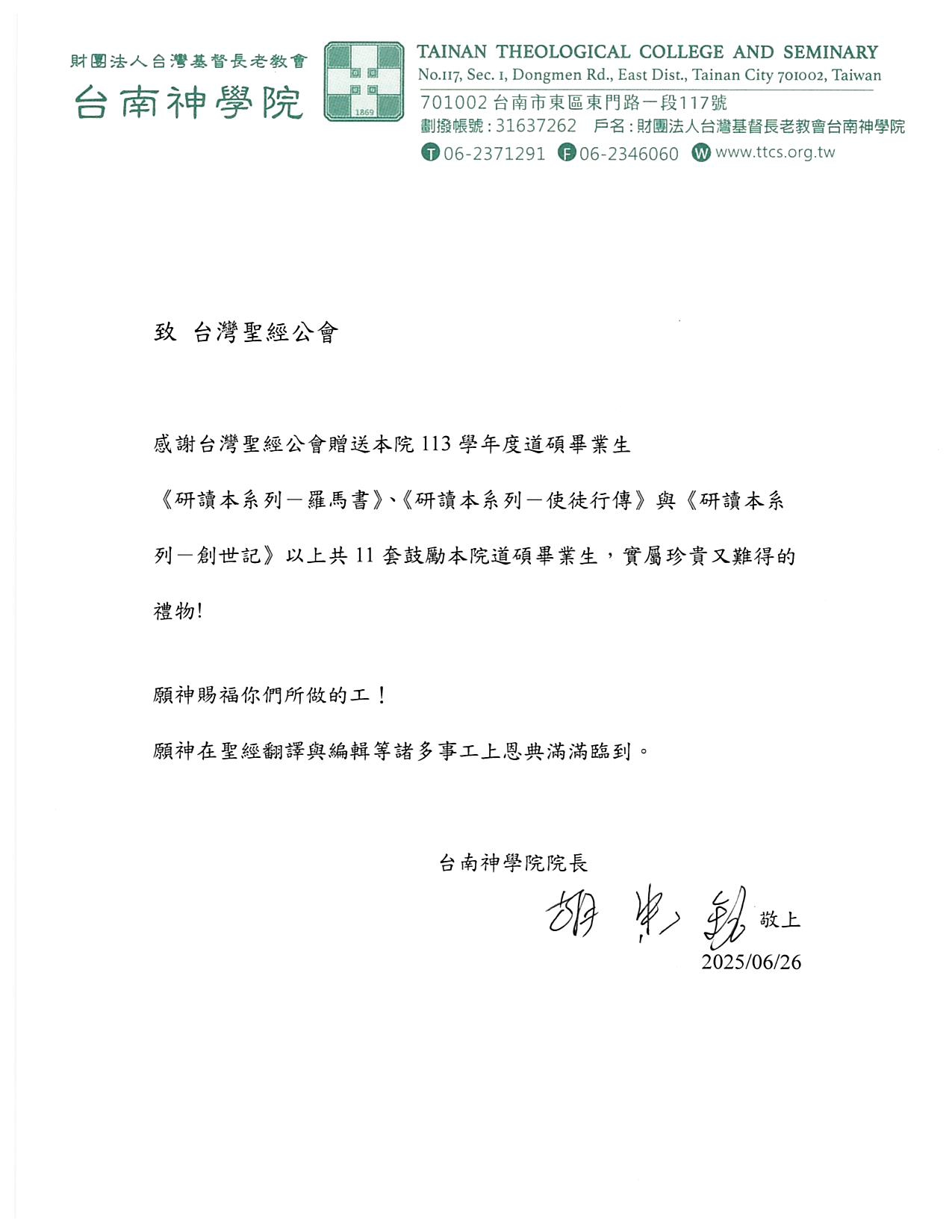 感謝台灣聖經公會致力於上主話語對於台灣各族語言的努力翻譯以及戮力釋義,願上主堅固你們手所做的每一件事工。也謝謝台灣聖經公會對於道碩畢業生的贈書,對於未來教會牧會了解並傳講上主話語有重要的幫助!