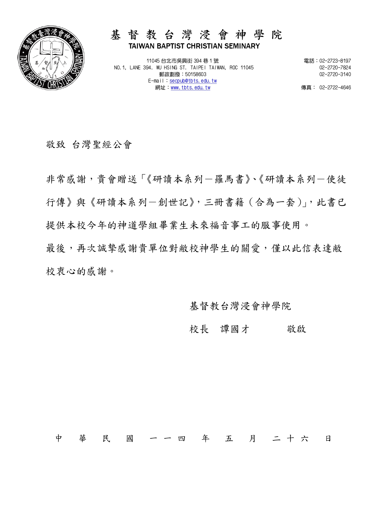 謝謝台灣聖經公會贈書給神學院畢業生