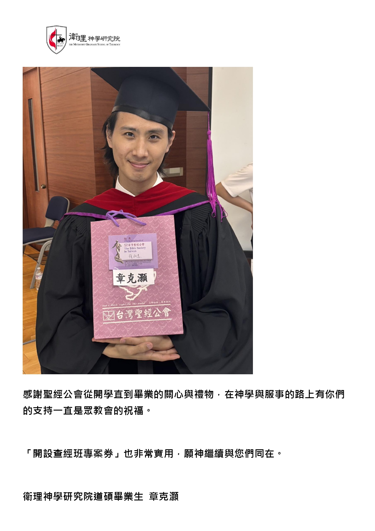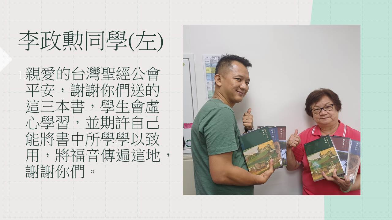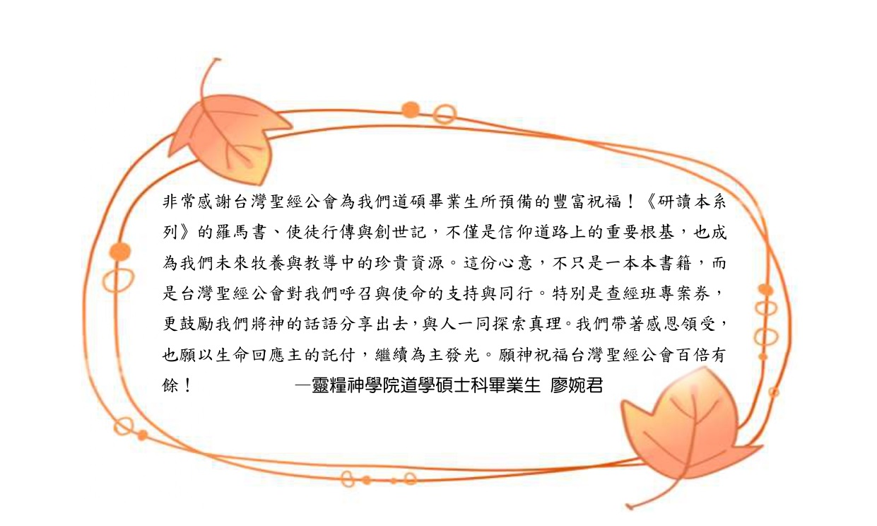 非常感謝台灣聖經公會對我們神學生的照顧與培育——從道碩一年級時贈與我們希臘文聖經,到碩三時再贈送研讀本,處處可見貴會對台灣神學教育與宣講上帝話語的重視。有您們作為我們背後堅強的支持,是極大的恩典。願上帝親自記念您們一切的辛勞與擺上!