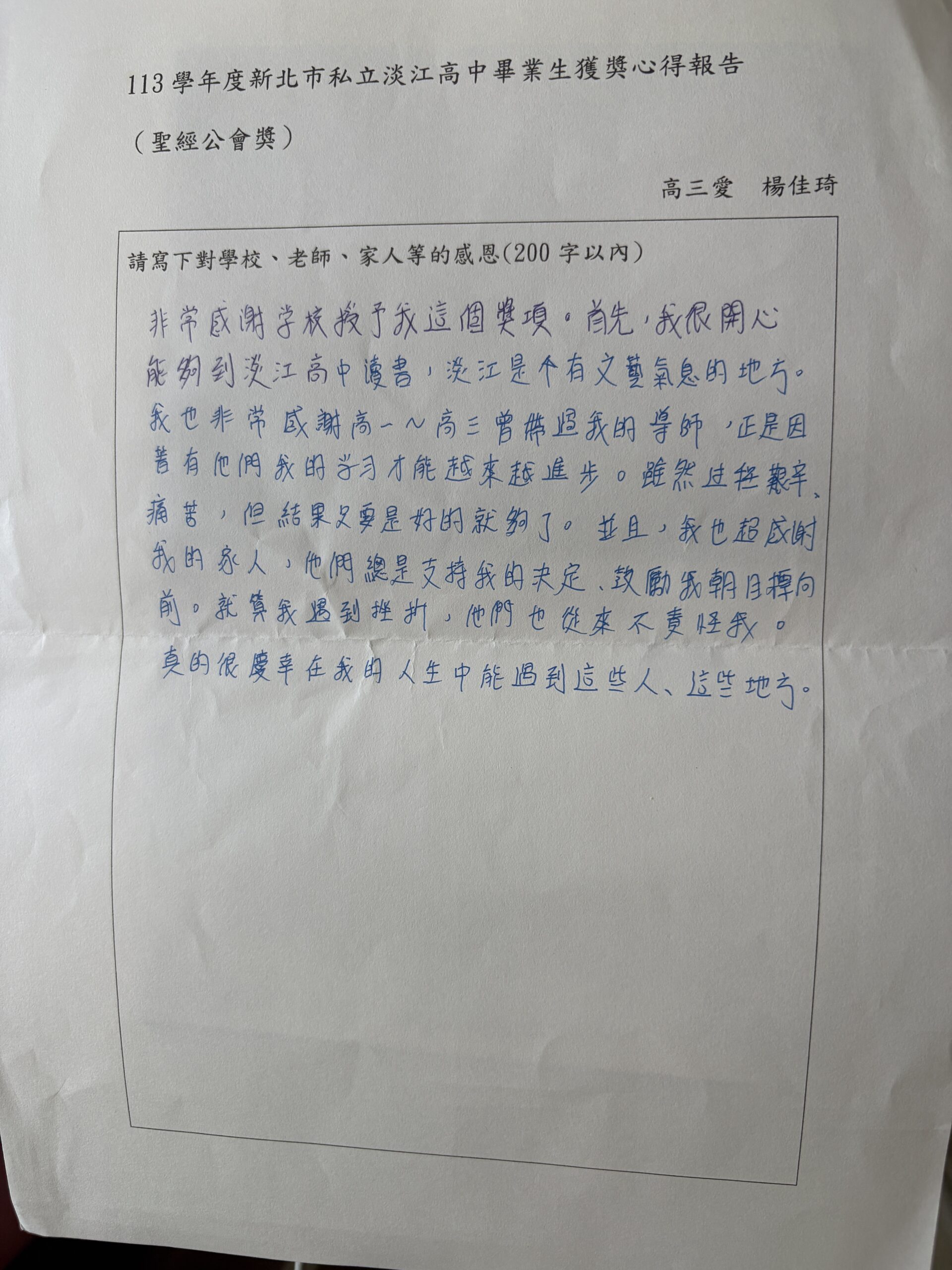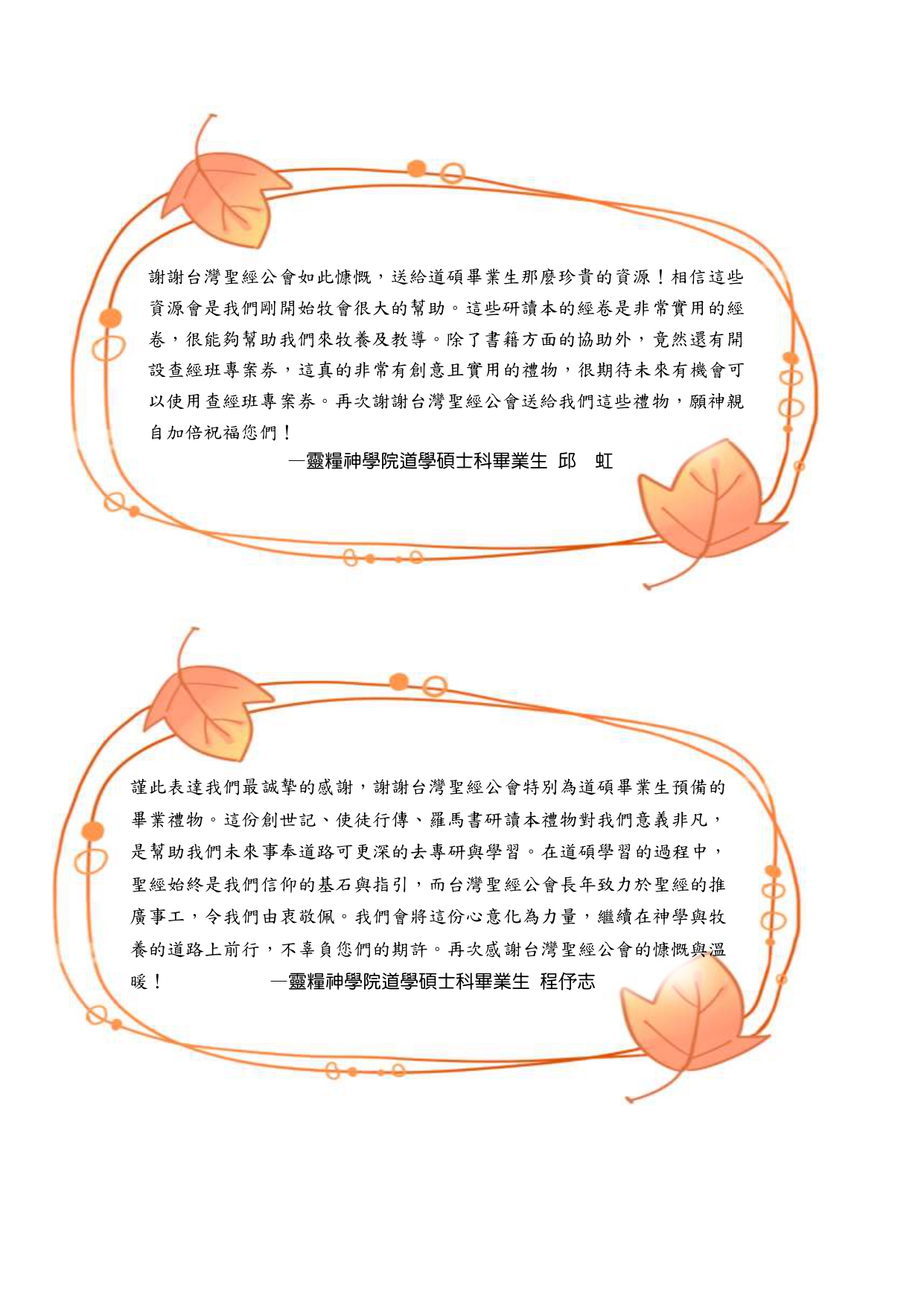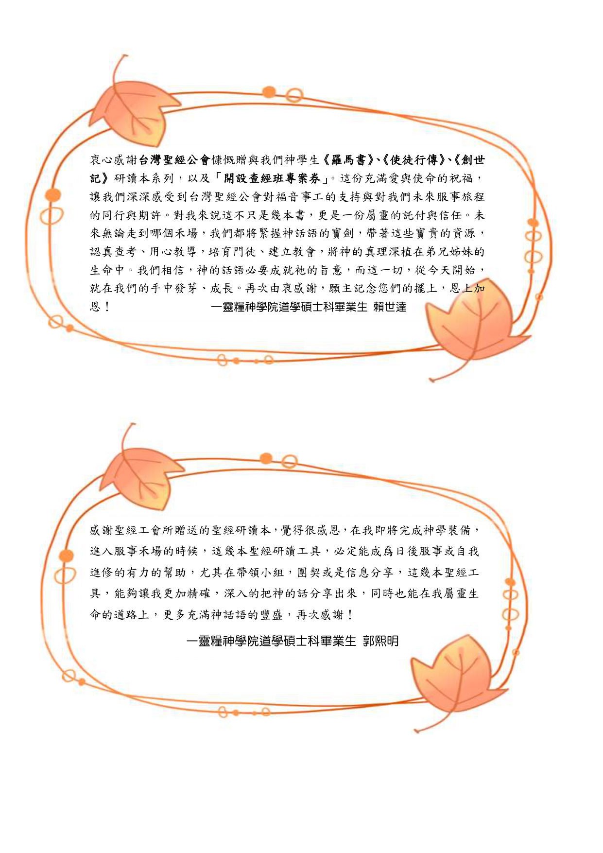 非常感謝台灣聖經公會對我們神學生的照顧與培育——從道碩一年級時贈與我們希臘文聖經,到碩三時再贈送研讀本,處處可見貴會對台灣神學教育與宣講上帝話語的重視。有您們作為我們背後堅強的支持,是極大的恩典。願上帝親自記念您們一切的辛勞與擺上!