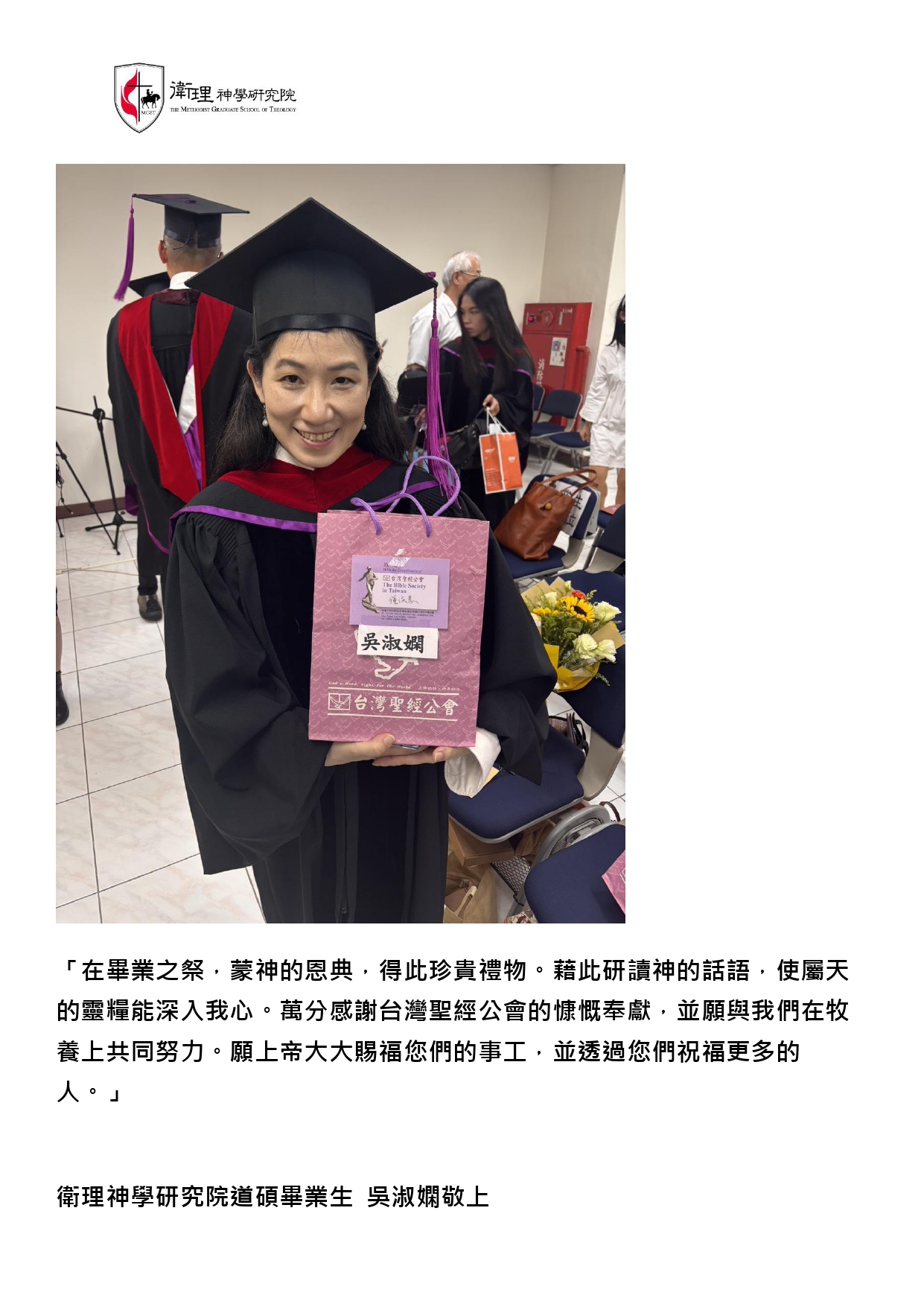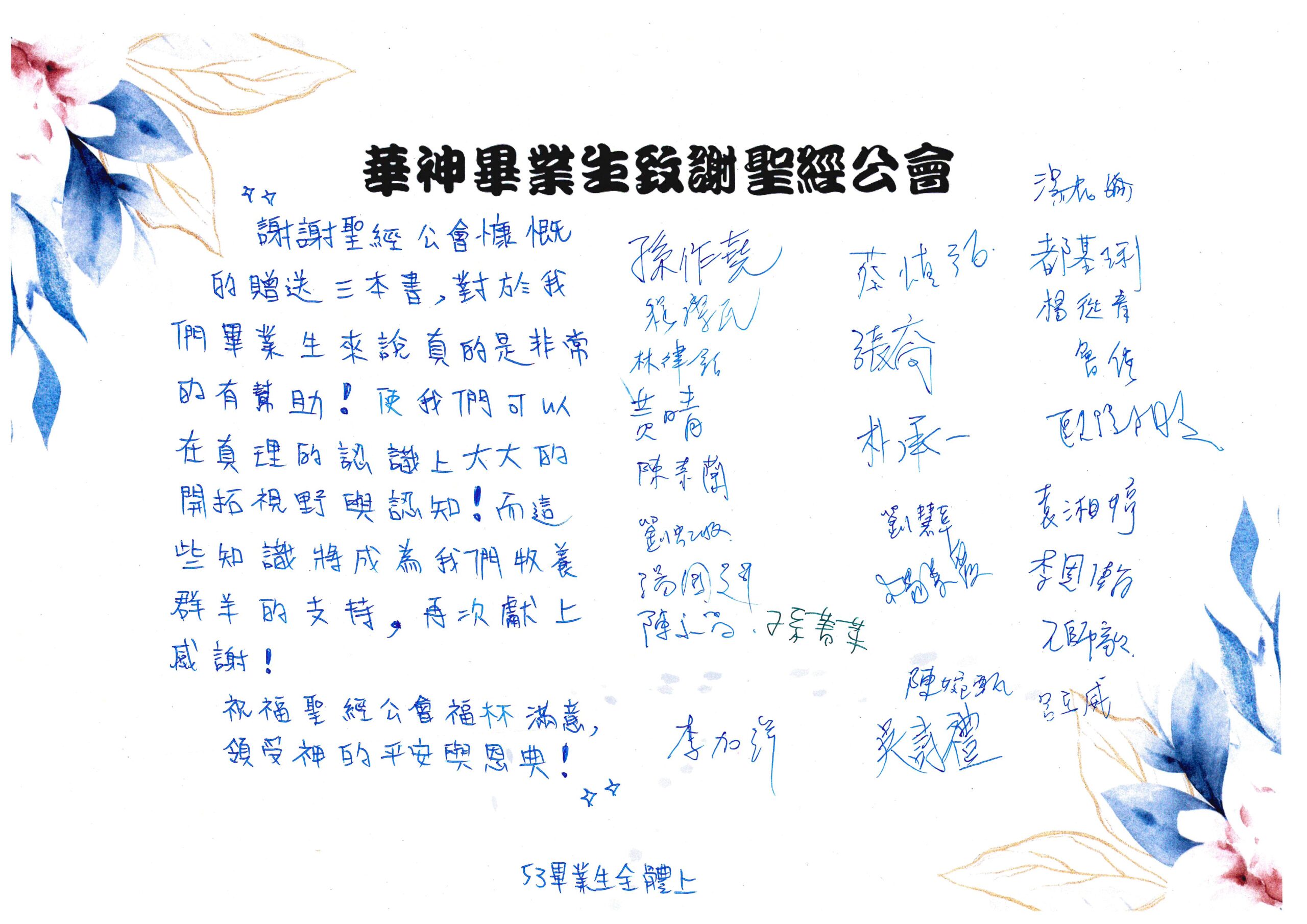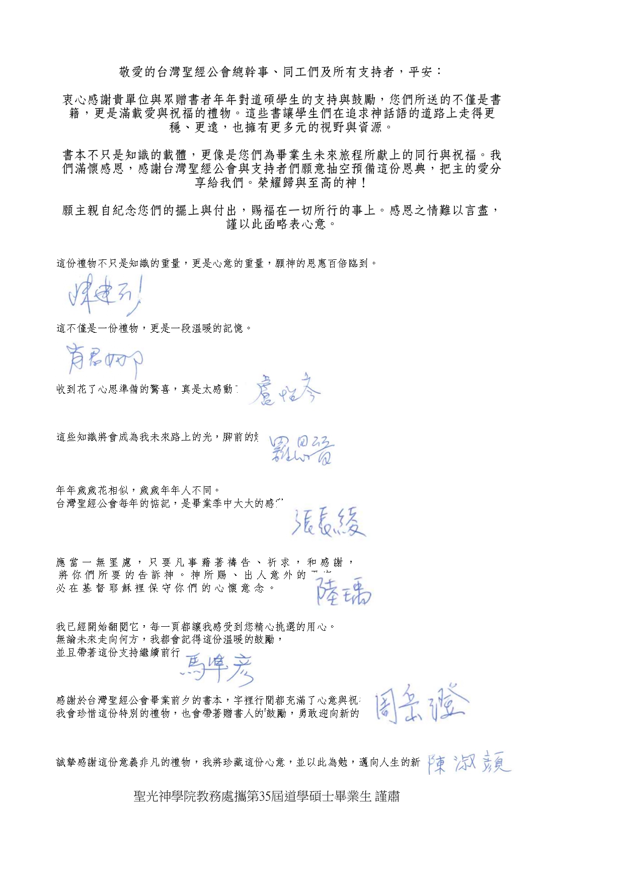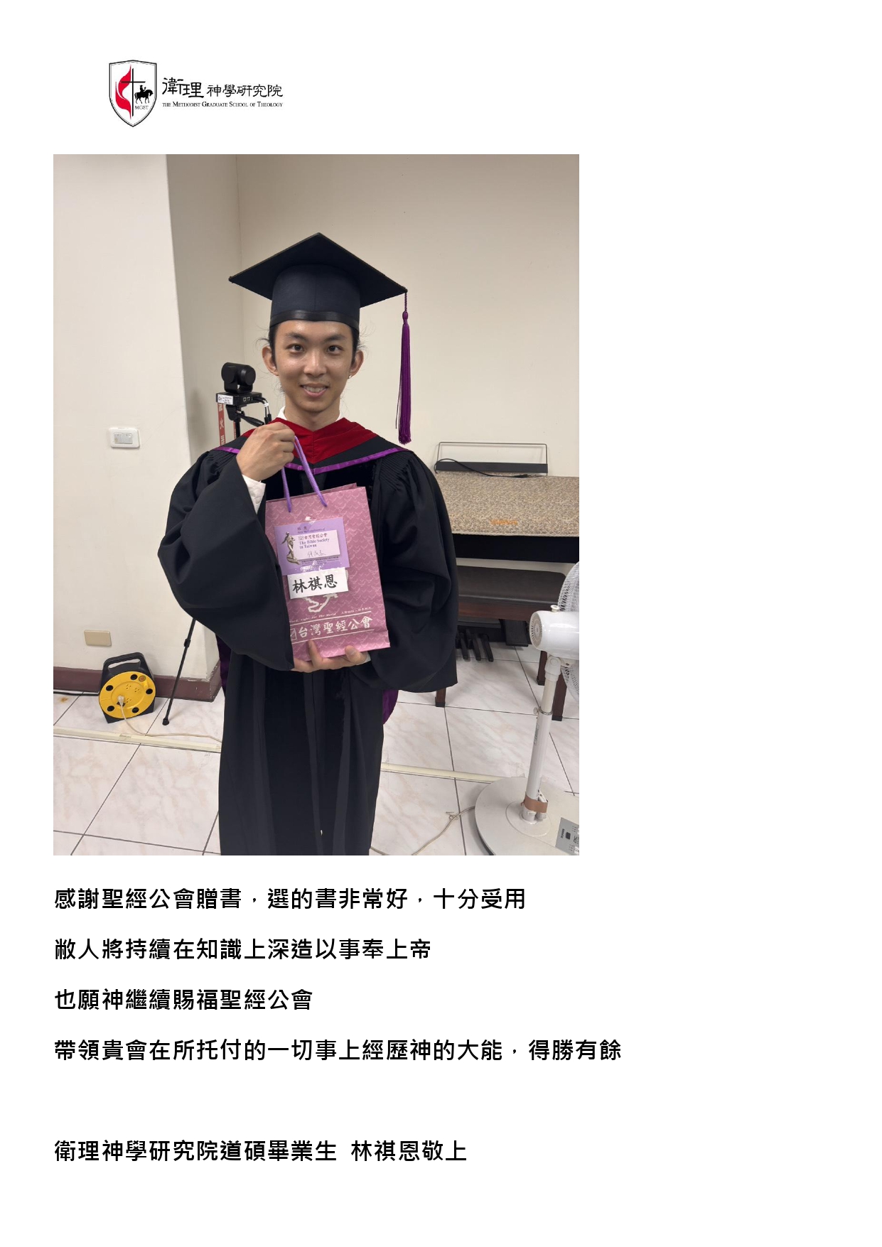 我們會將您們的幫助謹記在心裡,並且在畢業之後繼續努力學習上主的話語,不辜負您們的鼓勵與奉獻。同時也為您們的家庭、身體健康、工作祈禱,願我們的上主及主耶穌基督記念您們所做的工,賜下最大的祝福與恩典給予您們,讓您們凡事亨通。