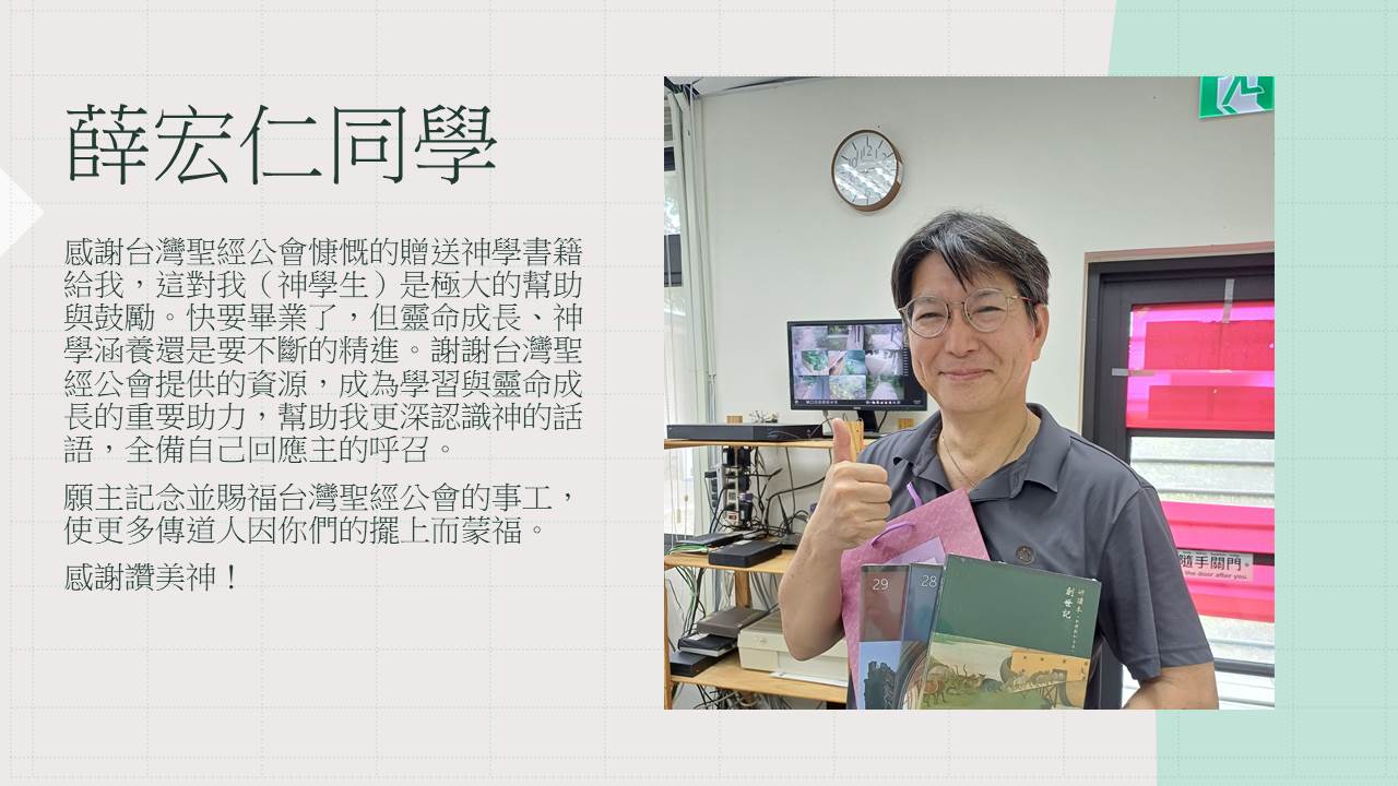 感謝台灣聖經公會的贈書,對我的傳道工作很有幫助,尤其在準備講道時,真是「書到用時方恨少」,書架上真需要有書,感謝台灣聖經公會體貼我們這群神學畢業生的用書需求。