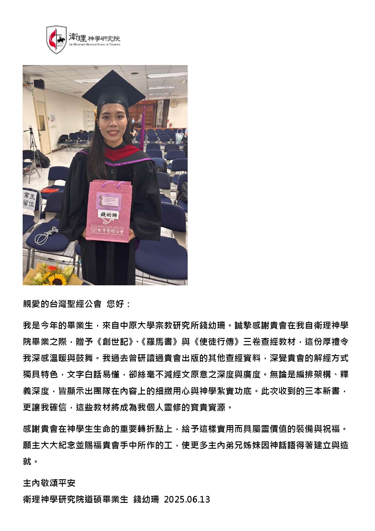 僅代表玉山神學院全體畢業生,向您們問安。感謝貴會贈送2024年度畢業生珍貴的禮物:『研讀本系列-羅馬書、使徒行傳、創世記』等9套的書籍。這些神學知識會使我們不忘記持續學習上主的話語、耶穌基督的教導,同時也是未來在牧會上最佳的指引。