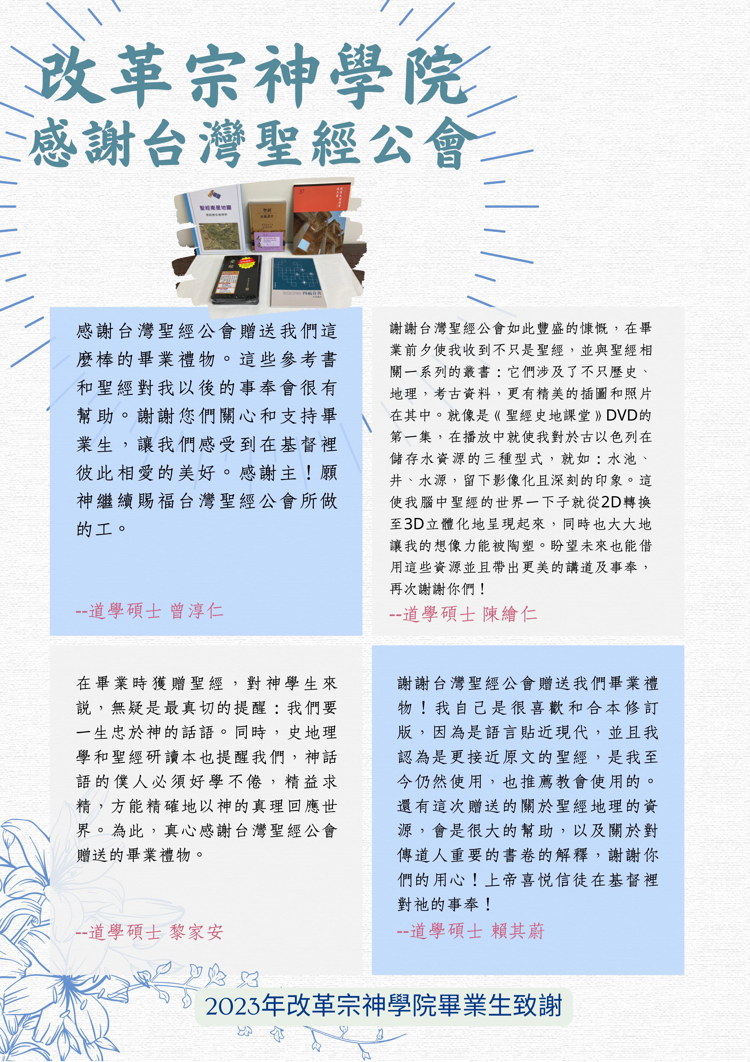 感謝台灣聖經公會一直以來對神學生的支持與鼓勵,更要特別感謝公會使終致力於聖經翻譯的工作。是你們的擺上,得讓神的工作在台灣各處結果。願神繼續賜福貴會所做的工。張景禎