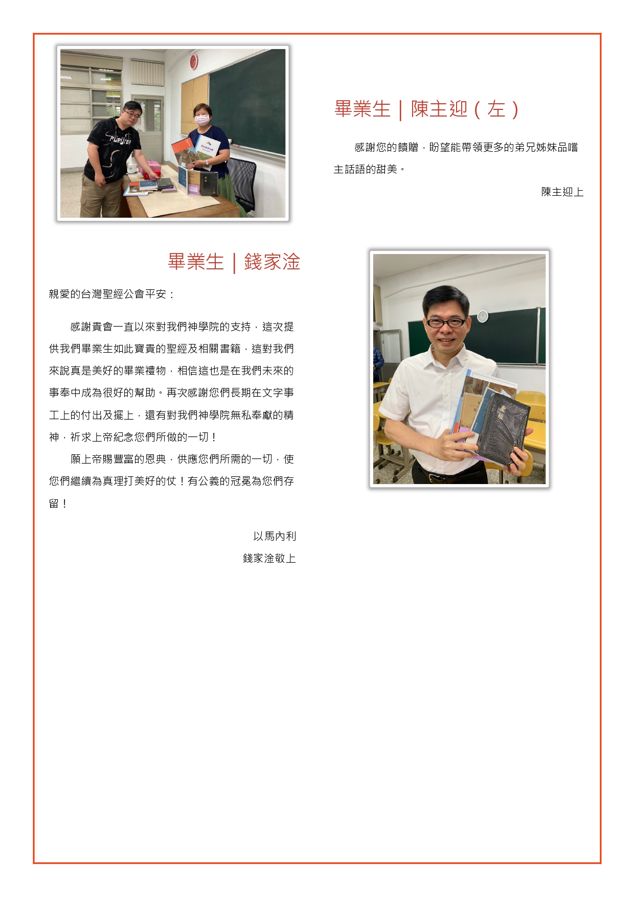 感謝台灣聖經公會贈與畢業班同學禮物。謝謝您們的愛與支持,這些禮物將會是我們前往牧會現場時的最大祝福。謝謝台灣聖經公會全體同仁。道碩畢業生 丁欣志敬上 |