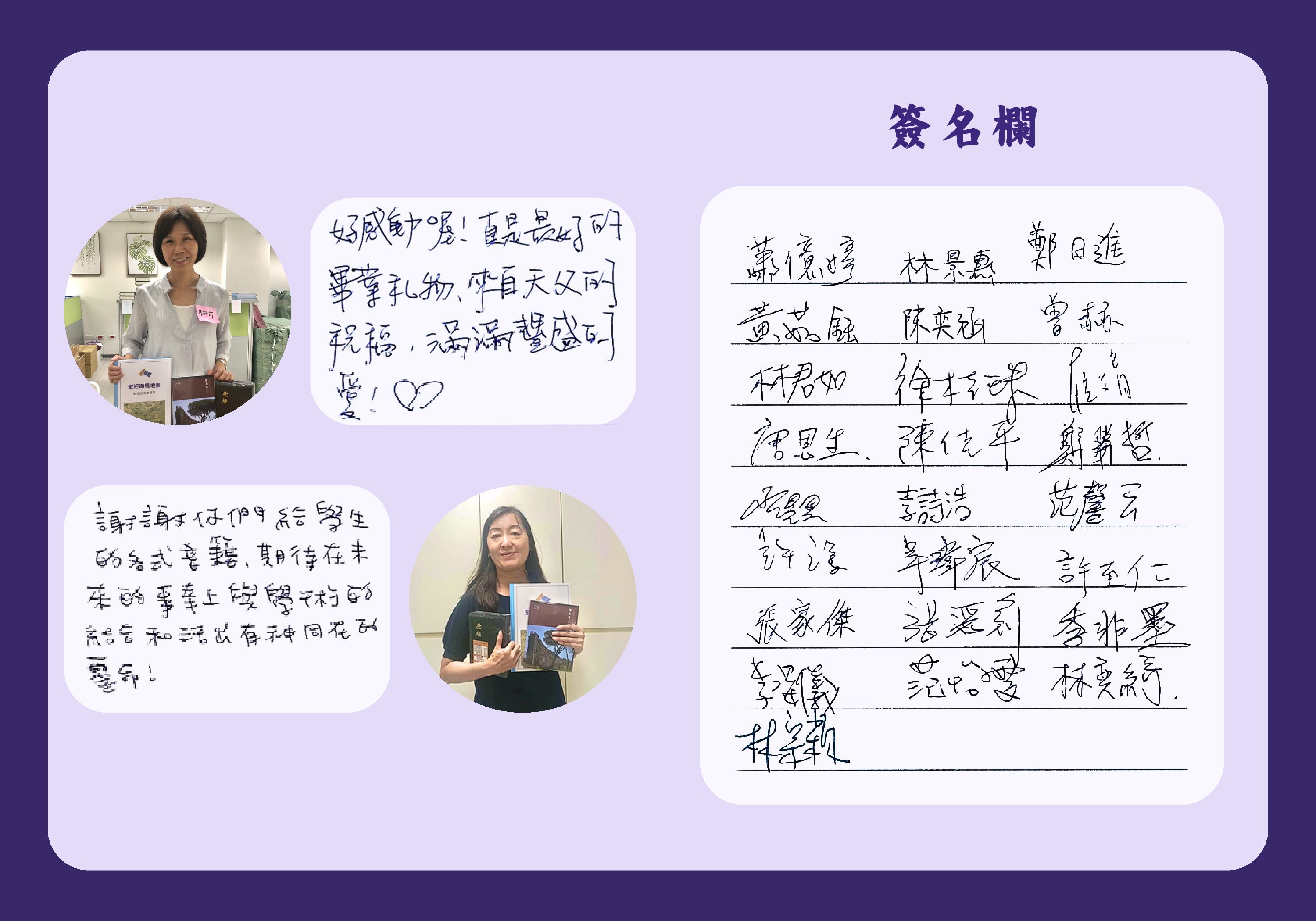「謝謝台灣聖經公會看重神學教育,奉獻聖經、神學等書籍,開闊學生的視野。願上主的靈加添在服事祂的人身上,萬事亨通、榮耀主名。」道碩三連以諾 |